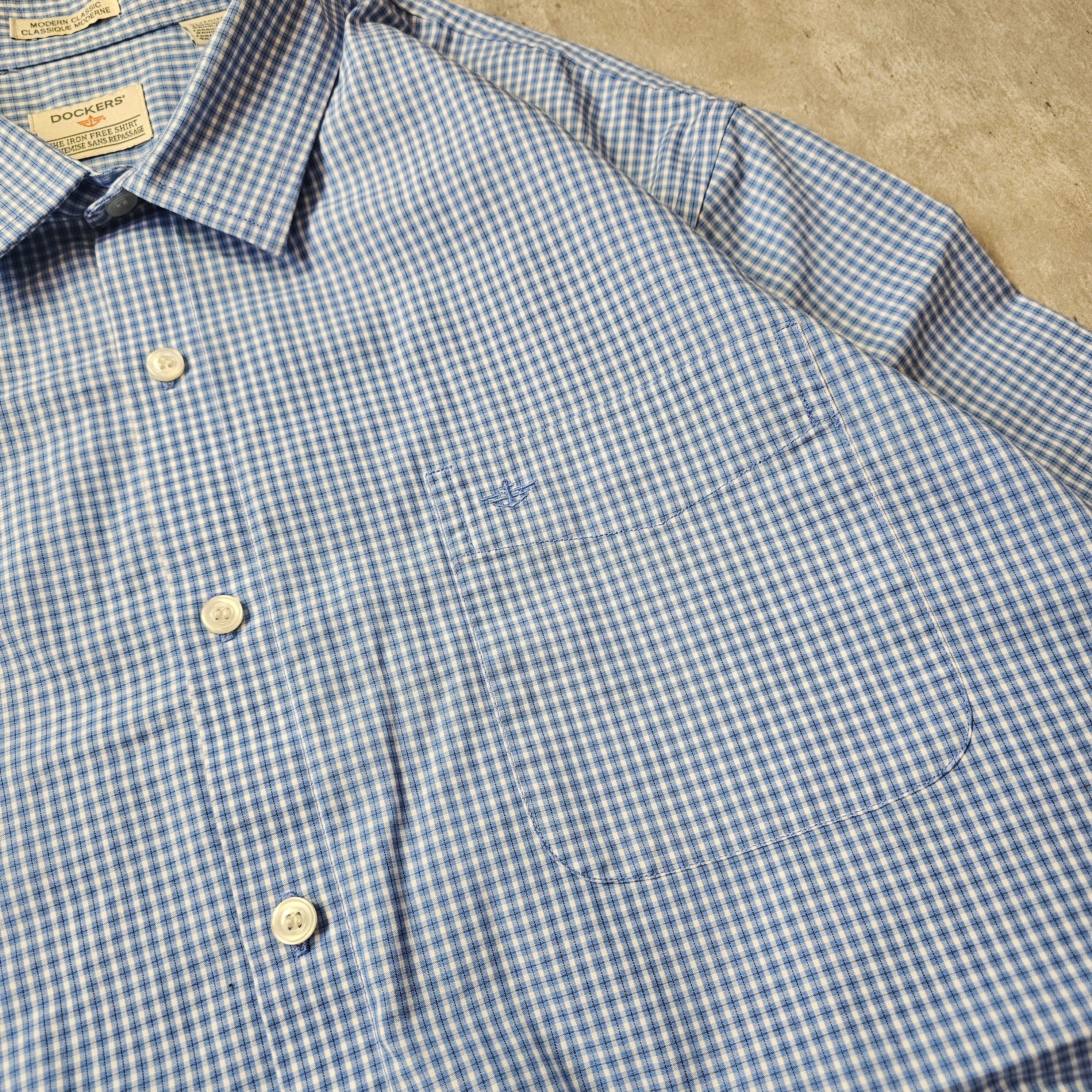 『 DOCKERS / ドッカーズ 』のチェックシャツは、清涼感溢れるサックス色に細かなチェック柄が映える一枚です!