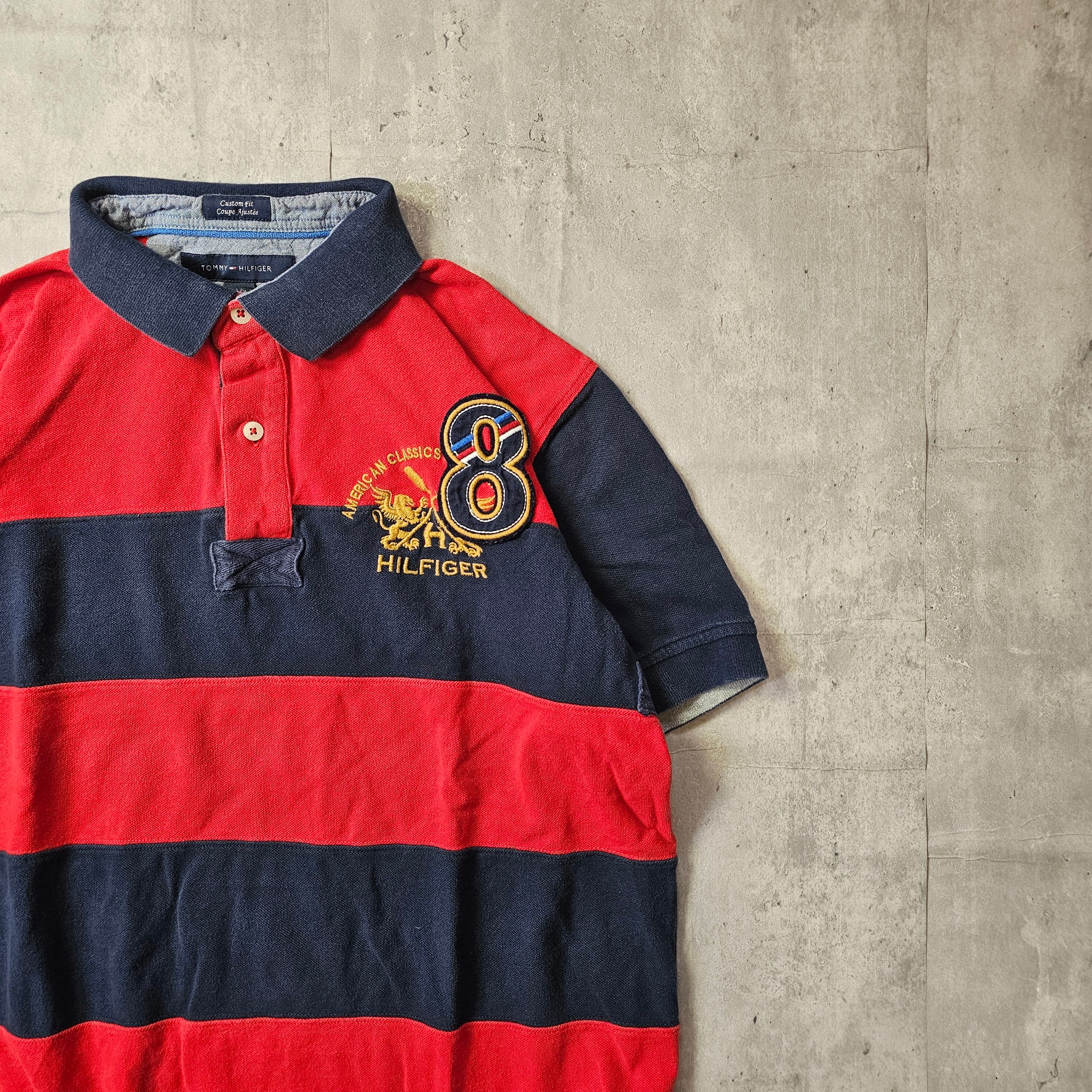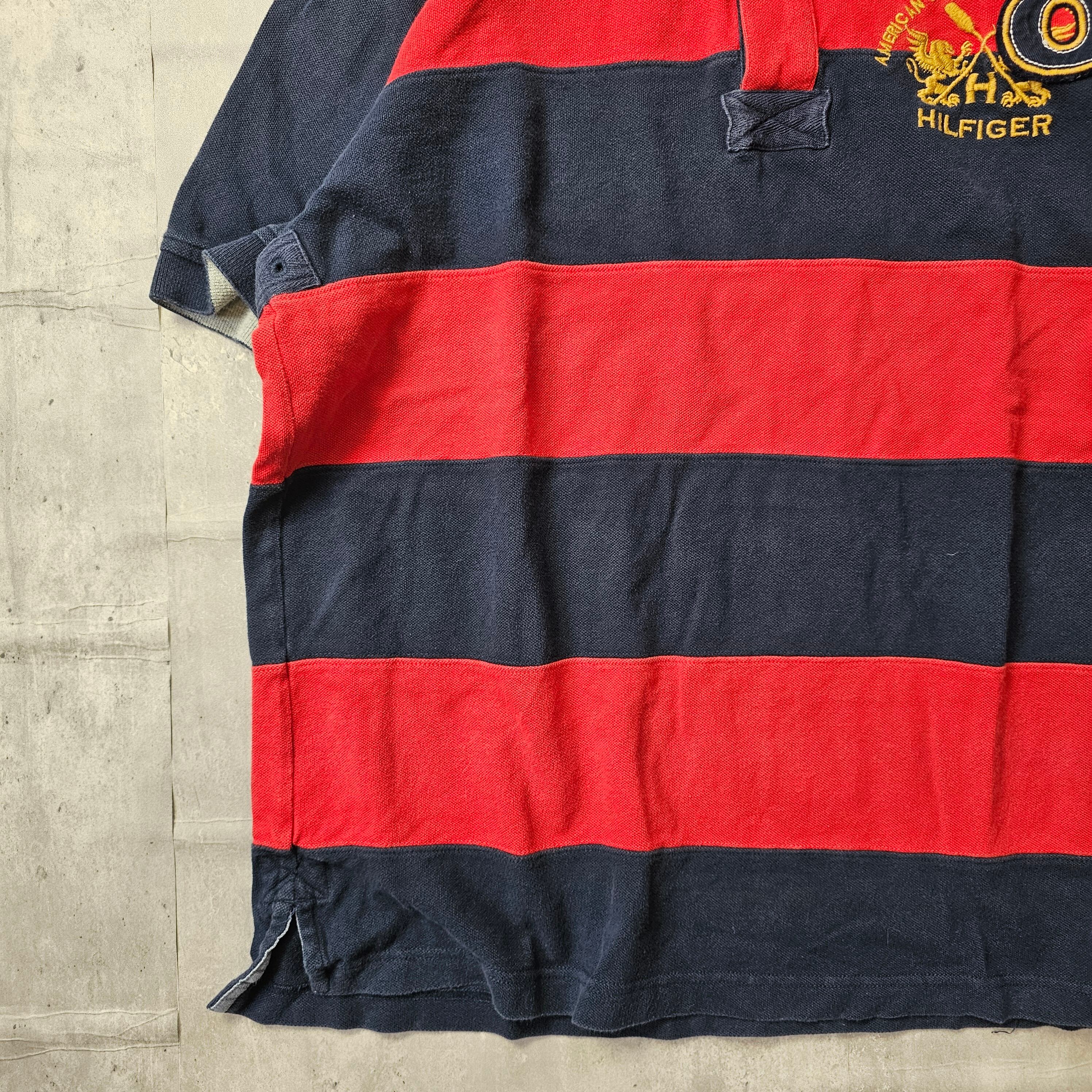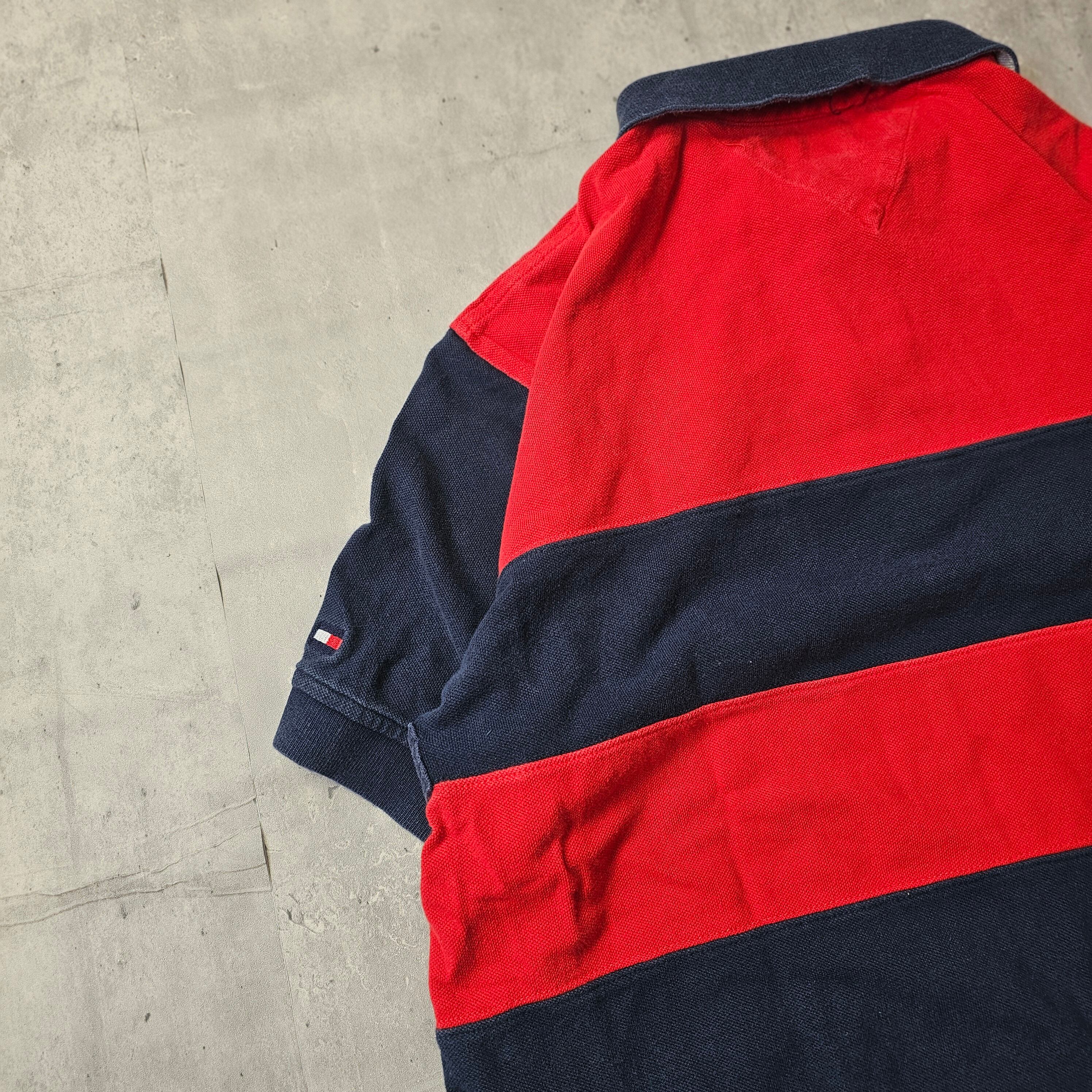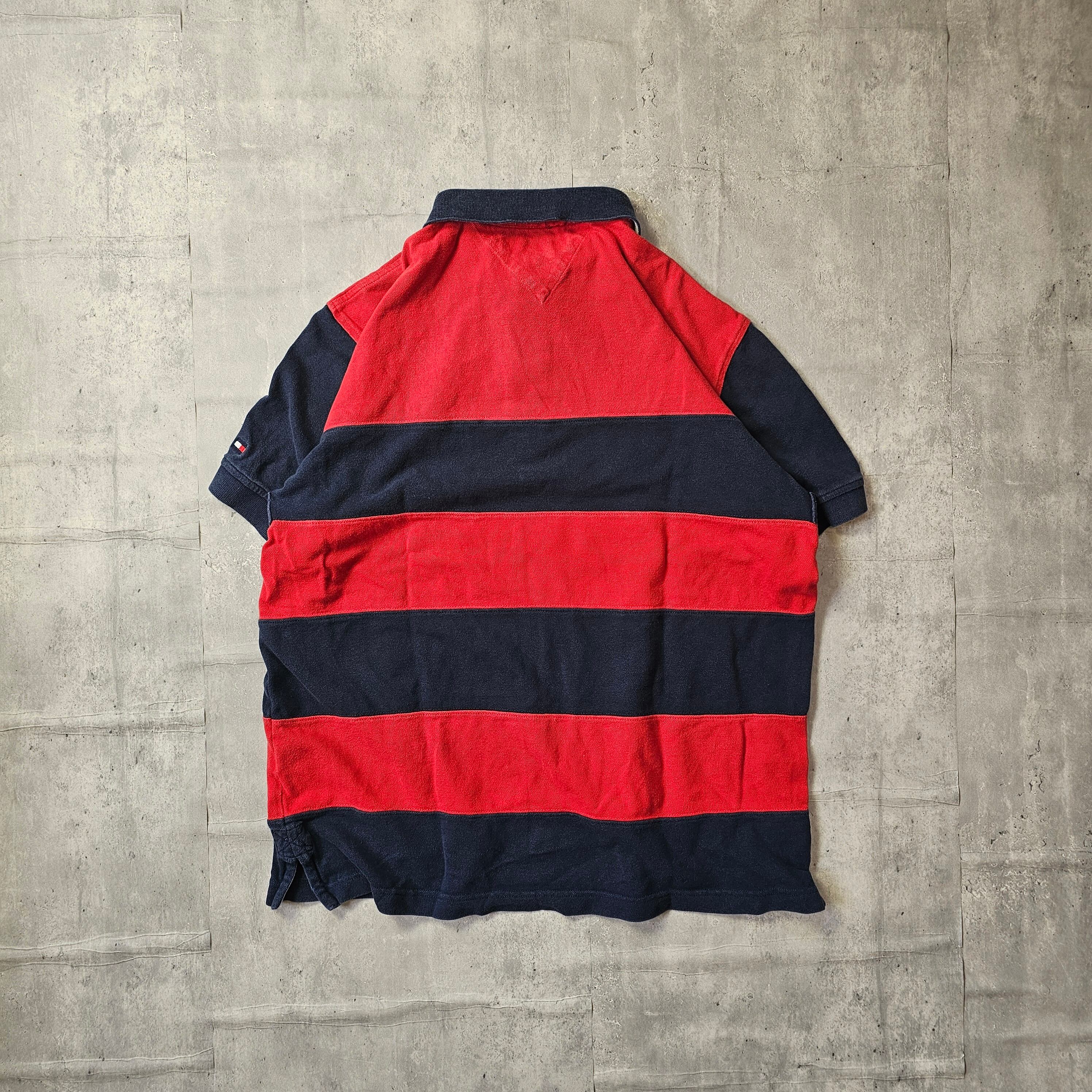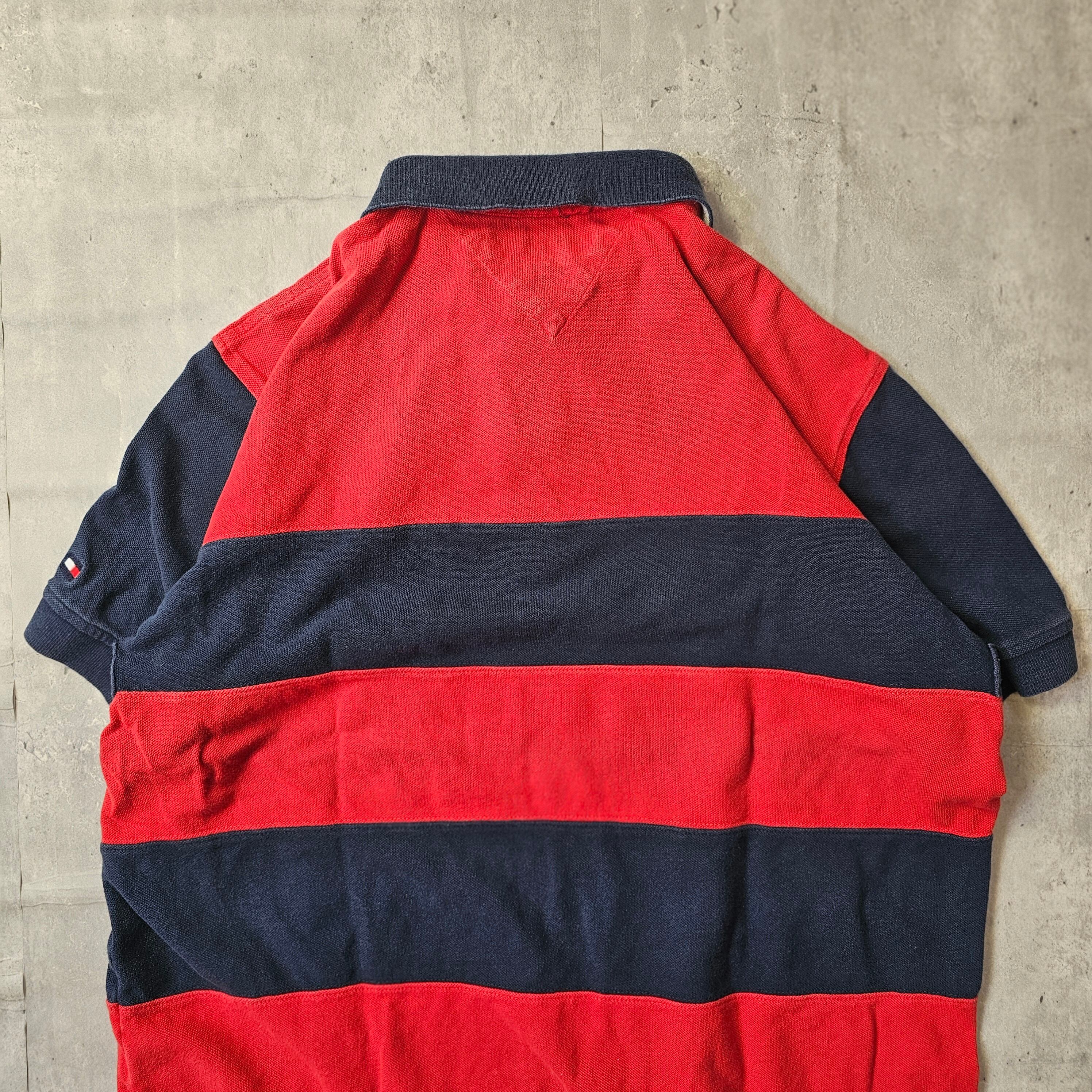 【『 TOMMY HILFIGER / トミーヒルフィガー 』 ボーダーポロシャツ ( Lサイズ ) ネイビー✕レッド色 】