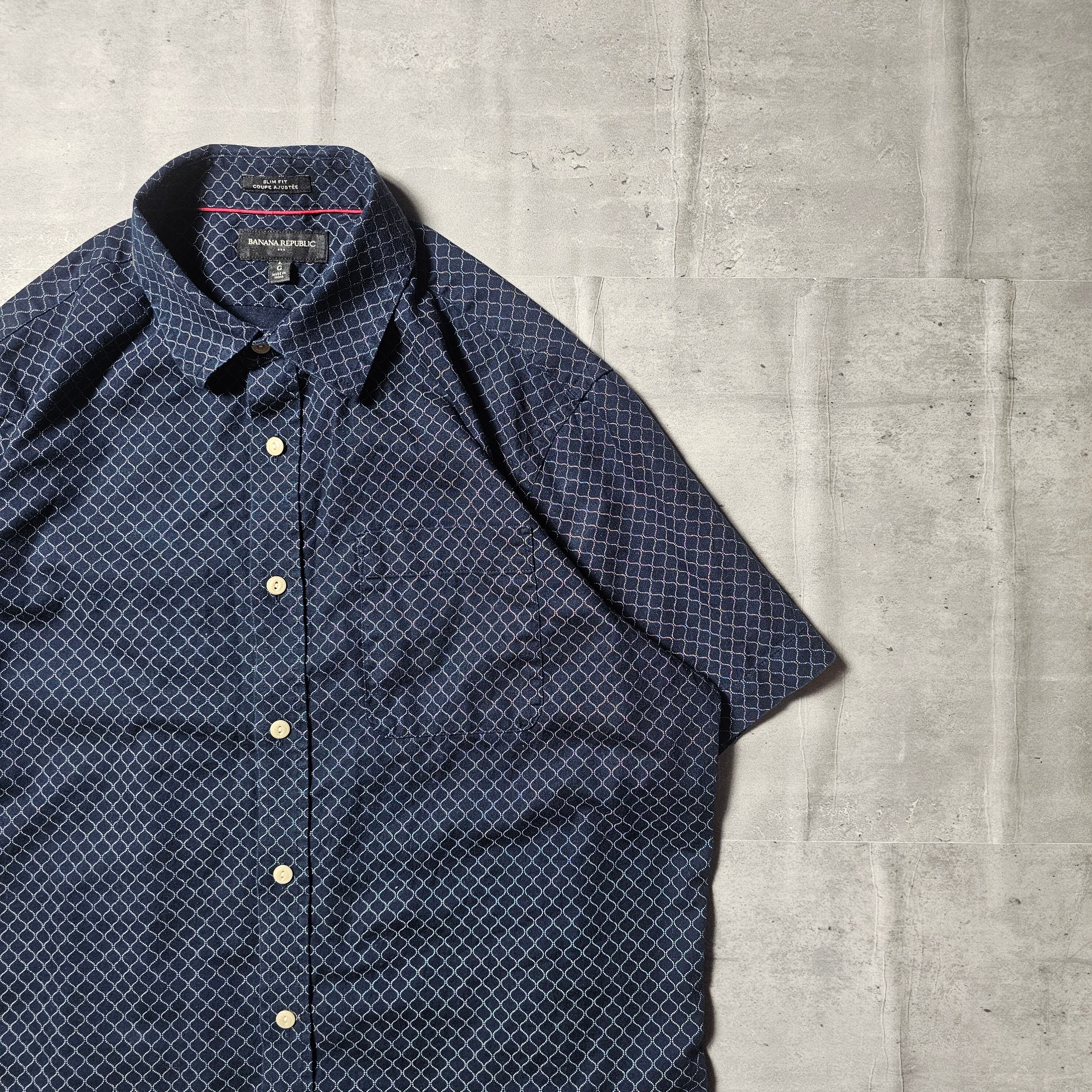 【『BANANAREPUBRIC / バナナリパブリック』 柄シャツ (Lサイズ) ネイビー色】