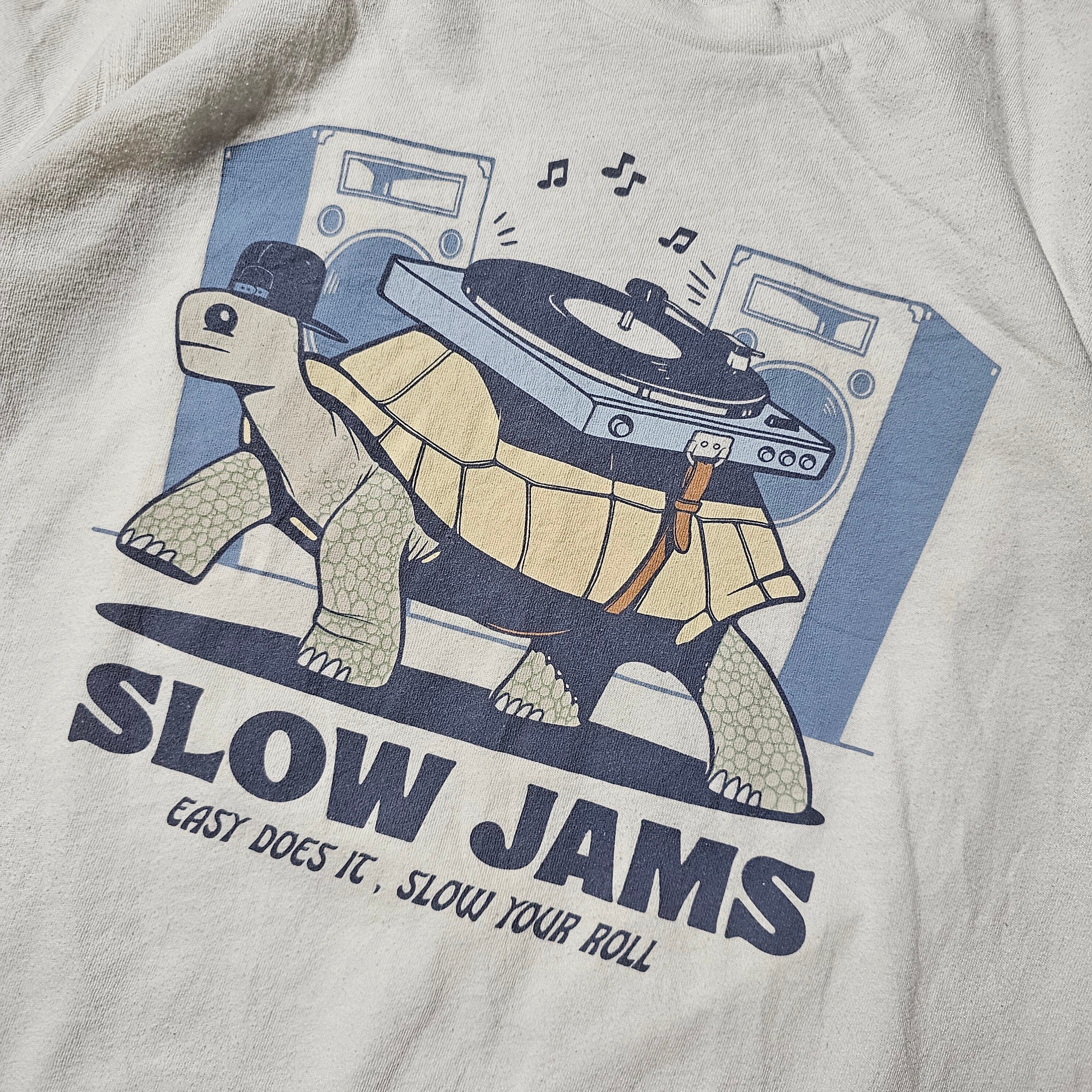 このTシャツには、「Show JAMS EASY DOES it slow your roll」というユニークなデザインが施され、音楽好きにはたまらない一枚です。