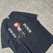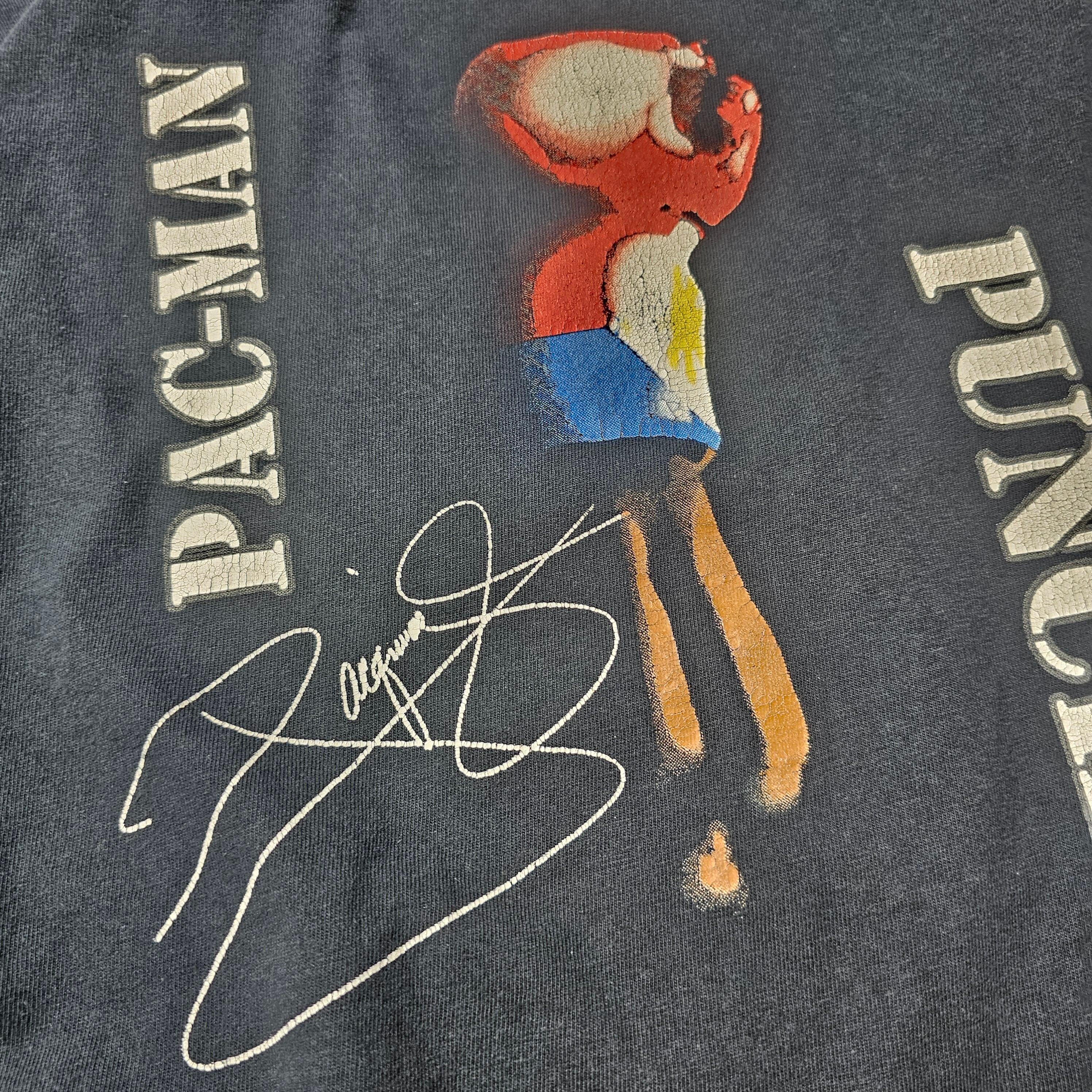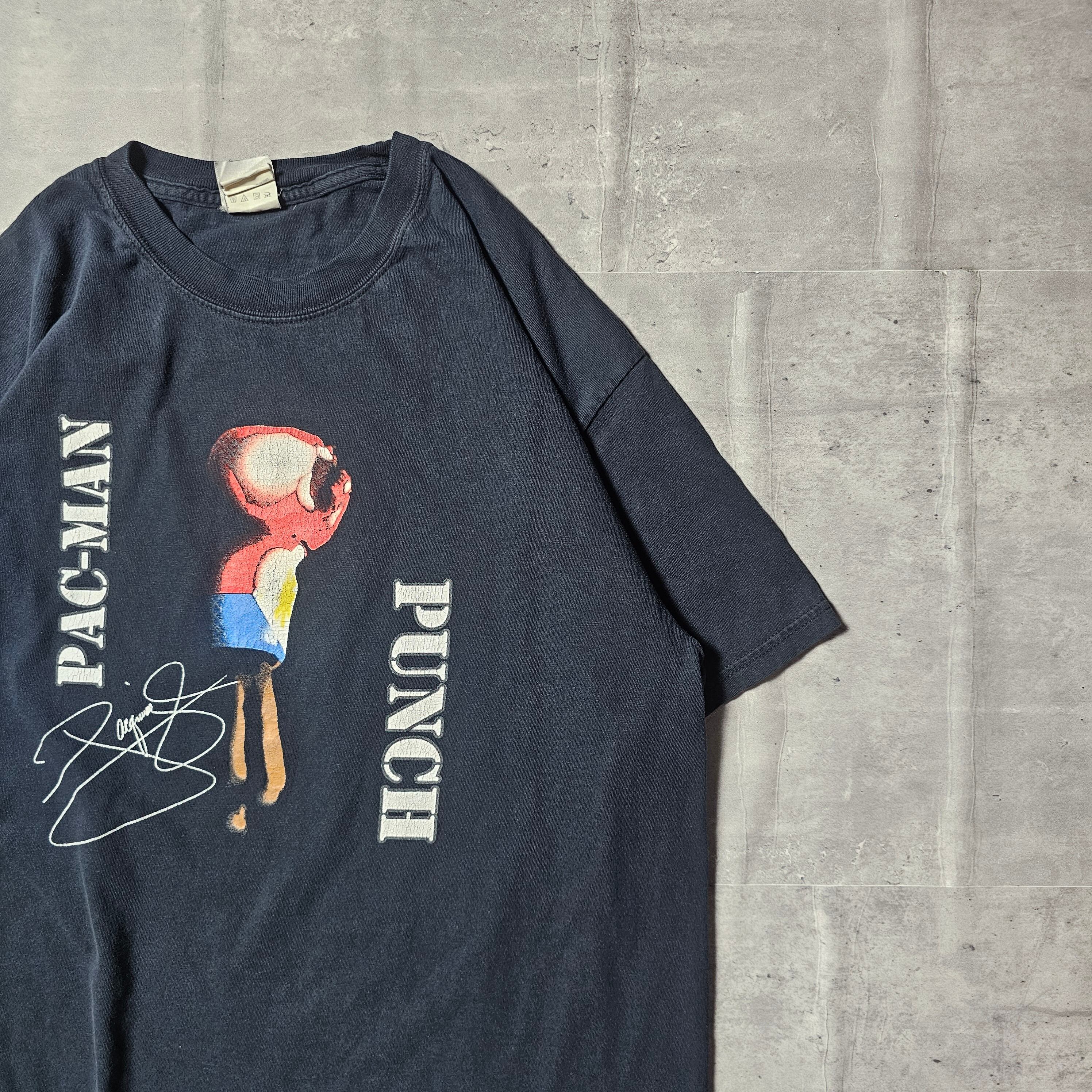 このTシャツは、フィリピンのプロボクサー、マニー・パッキャオの音楽アルバム『Pac-man Punch』のデザインが大きくプリントされており、個性的でユニークな一枚に仕上がっています。
