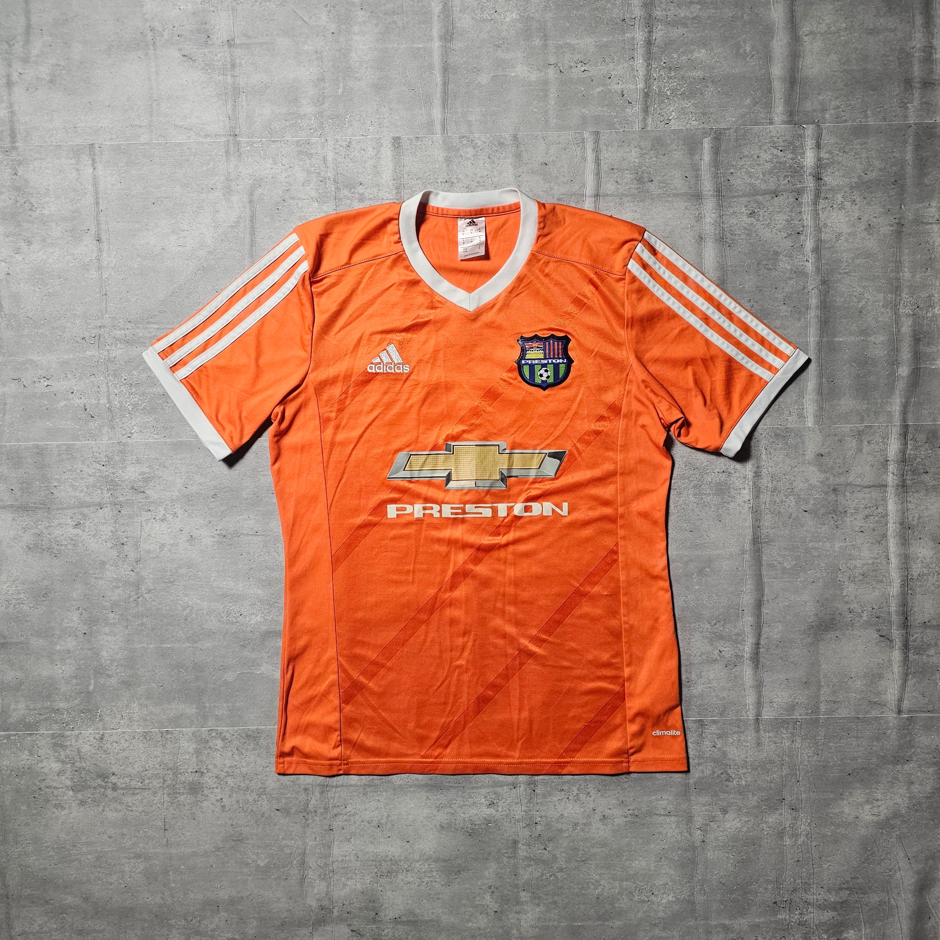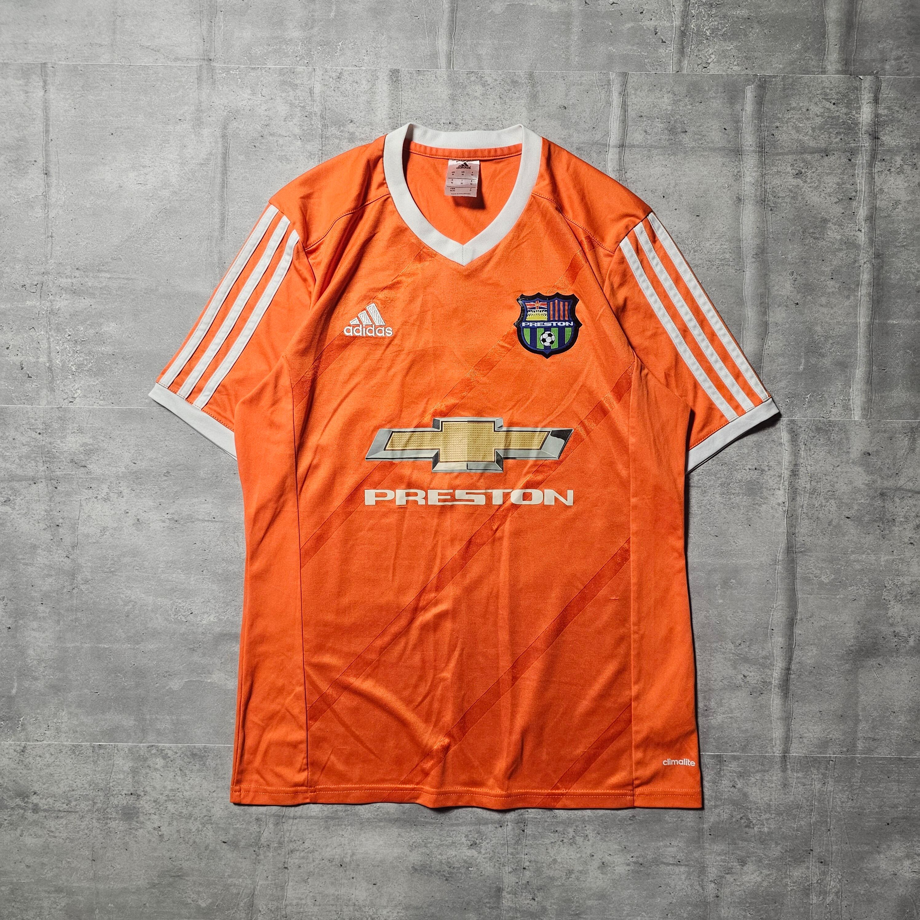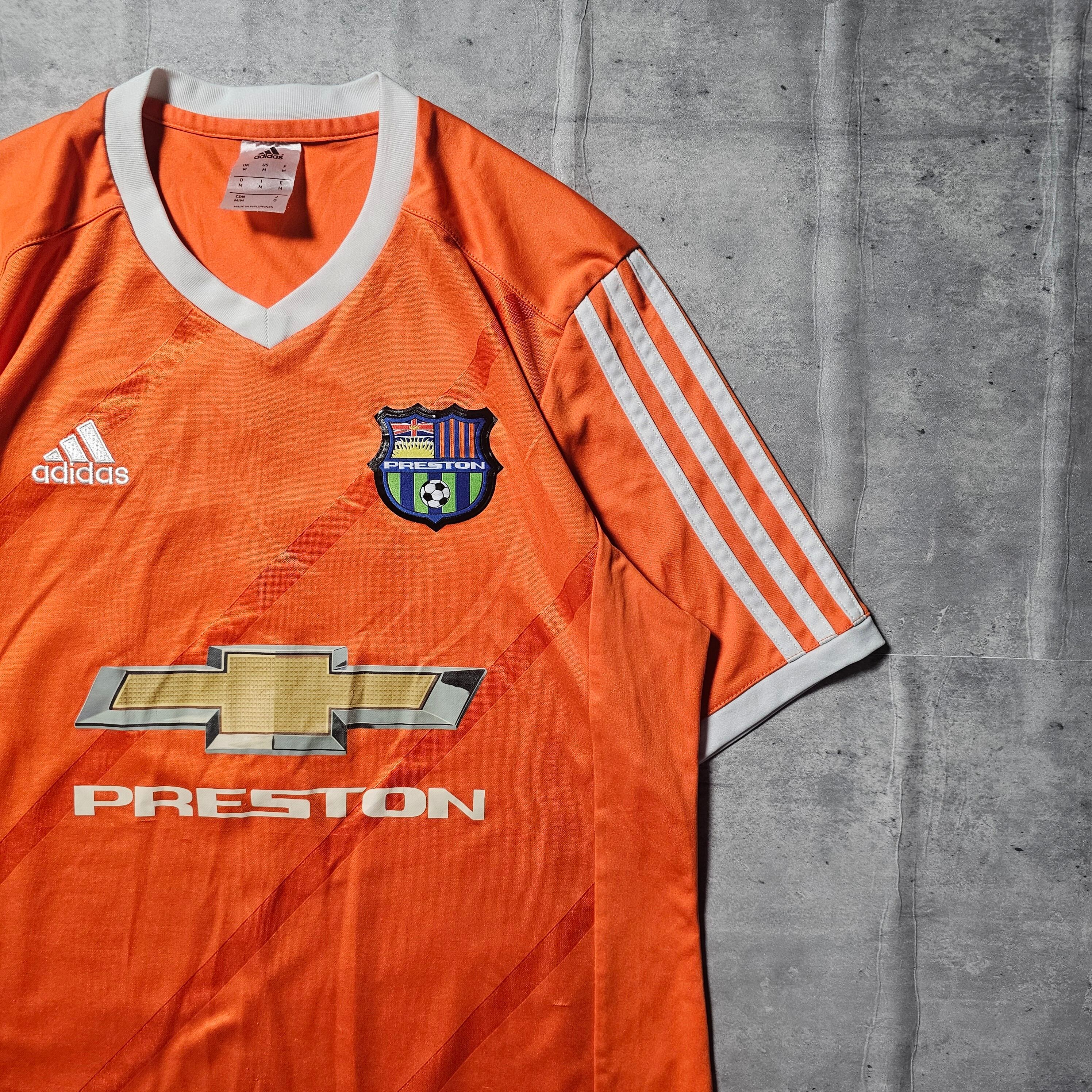 このシャツは、目を引くオレンジ色のデザインに『PRESTON』の文字とChevroletのロゴ、加えてエンブレムがプリントされていて、サッカーシーンでの存在感を際立たせます。