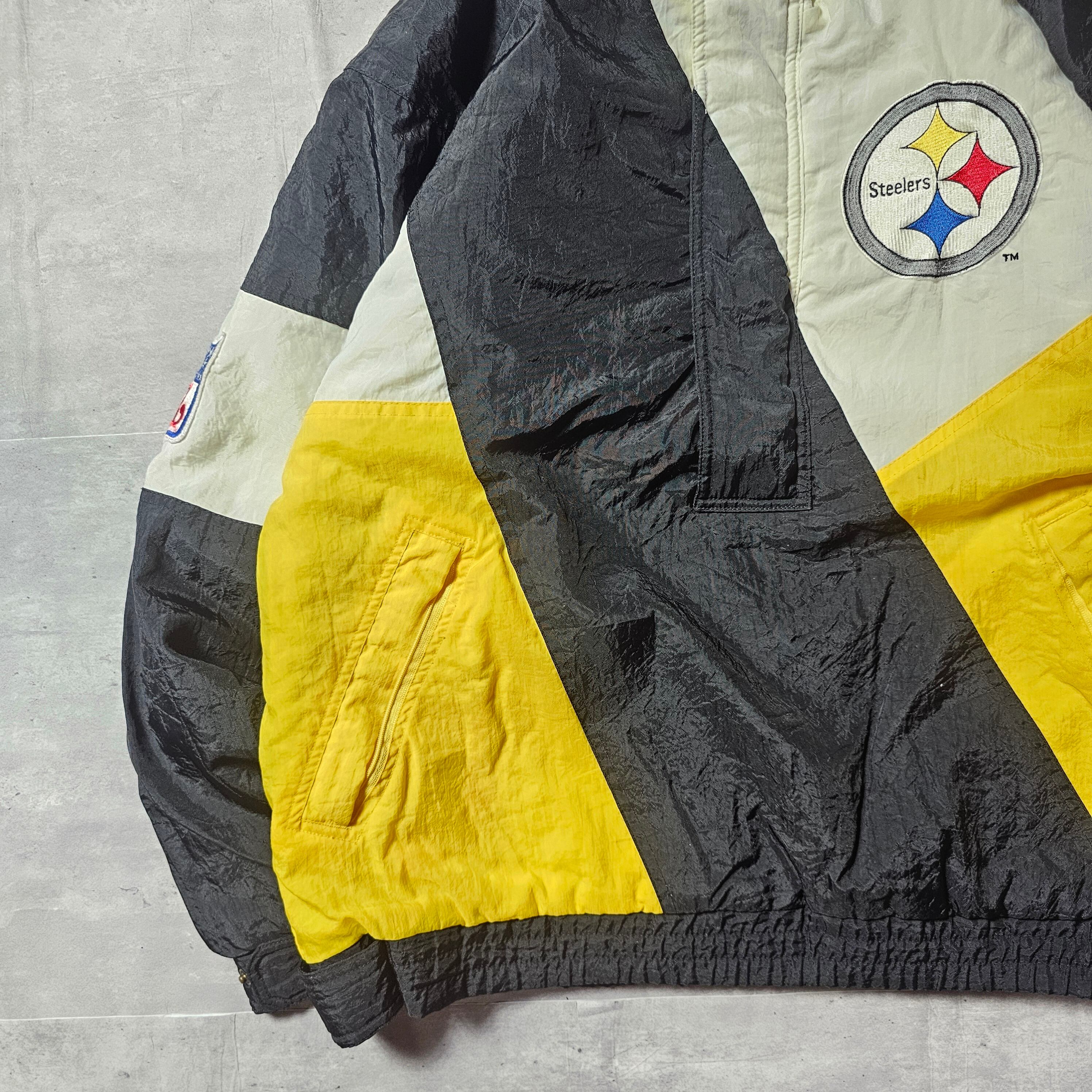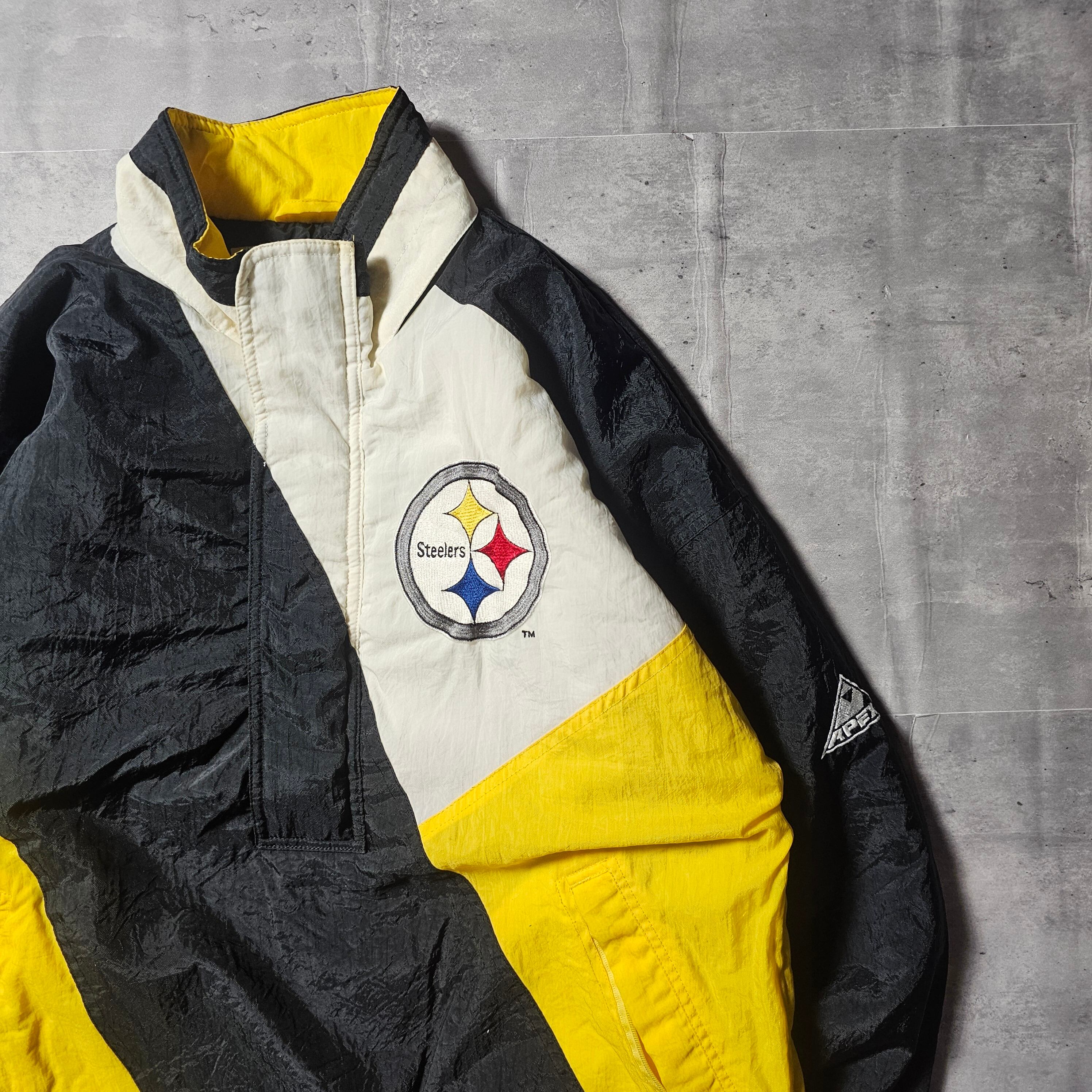 このブラック色のジャケットは、NFLスティーラーズのロゴが刺繍デザインで施されており、個性的でインパクトのある一枚に仕上がっています。