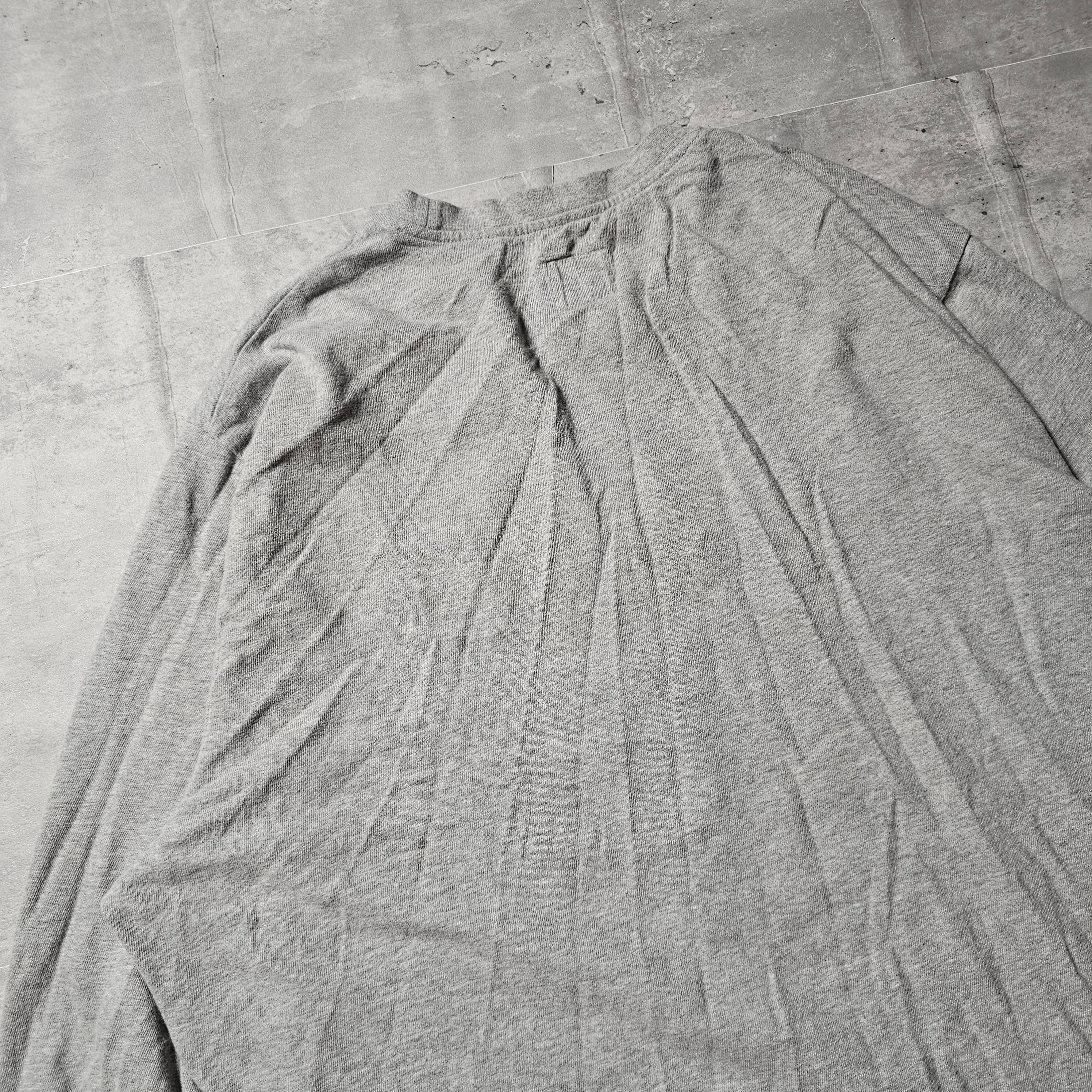 このグレー色のロンティーは、ボックスシルエットのデザインが特徴で、身幅広く着丈短めの設計により、リラックスしたスタイルを提供します。