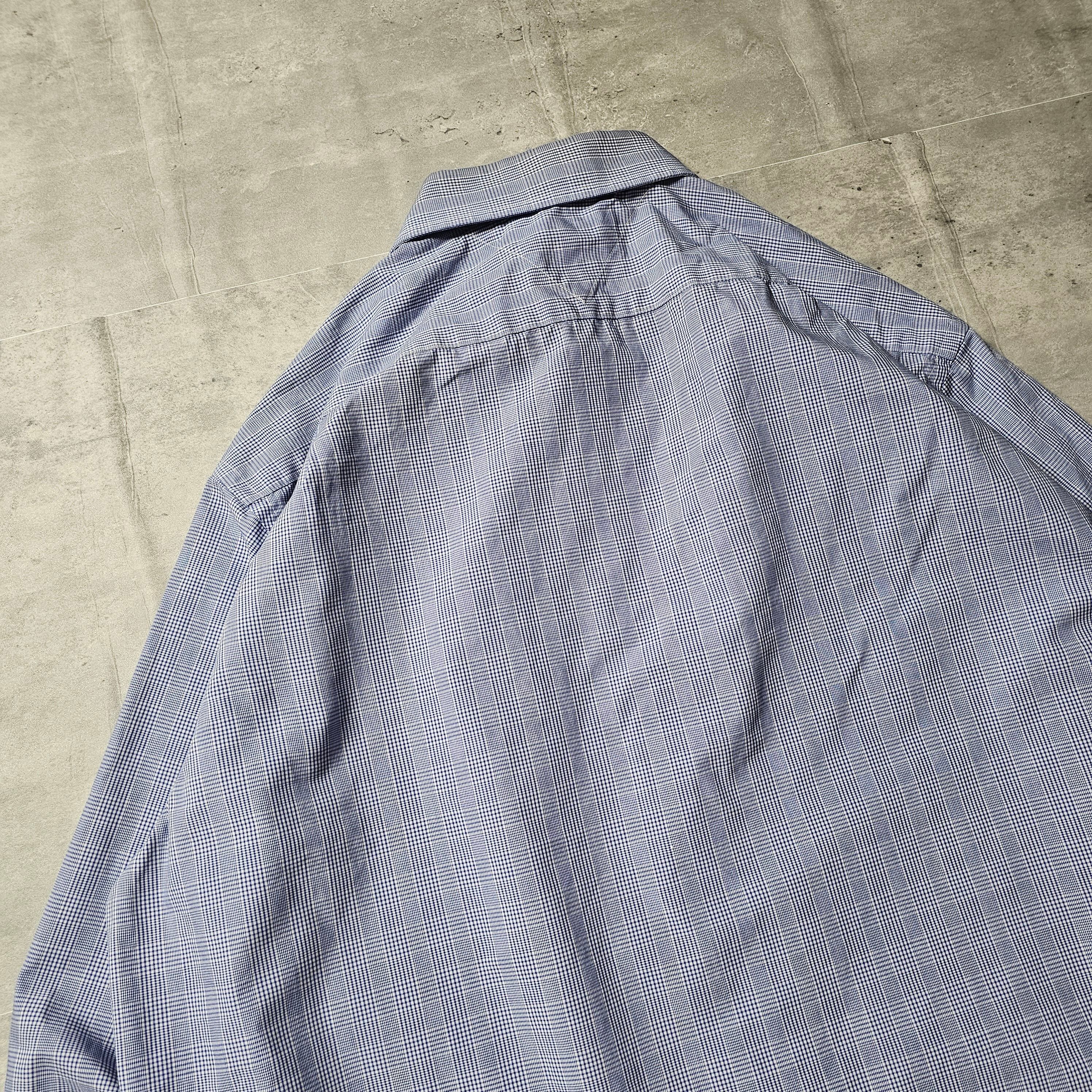 このブルー色のシャツは、細かなチェック柄が特徴で、カジュアルな中にも落ち着いた印象を与えます。