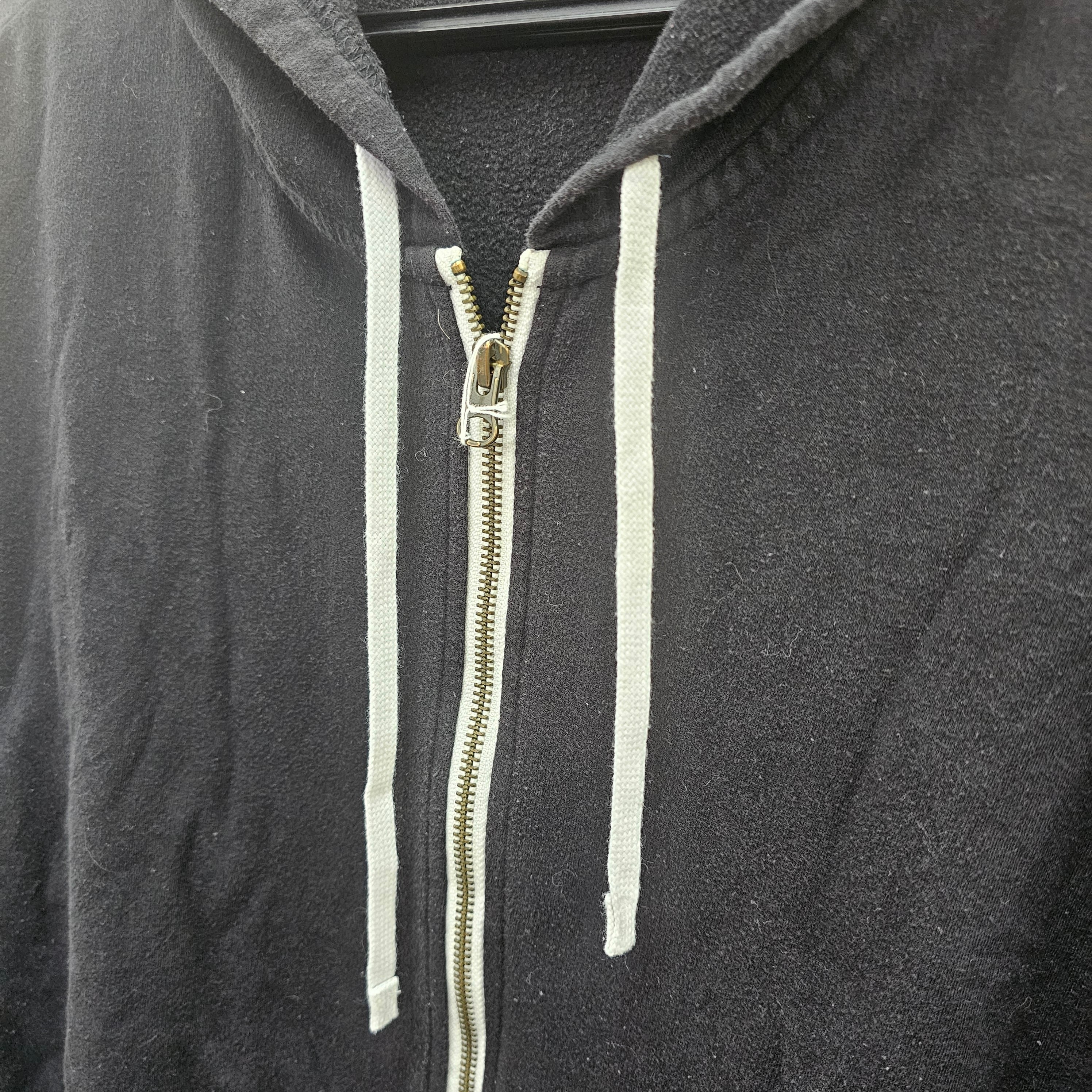 引き締まったブラック色が魅力的で、フード紐とジップ部分に施された白色のアクセントがスタイリッシュさを引き立てます。