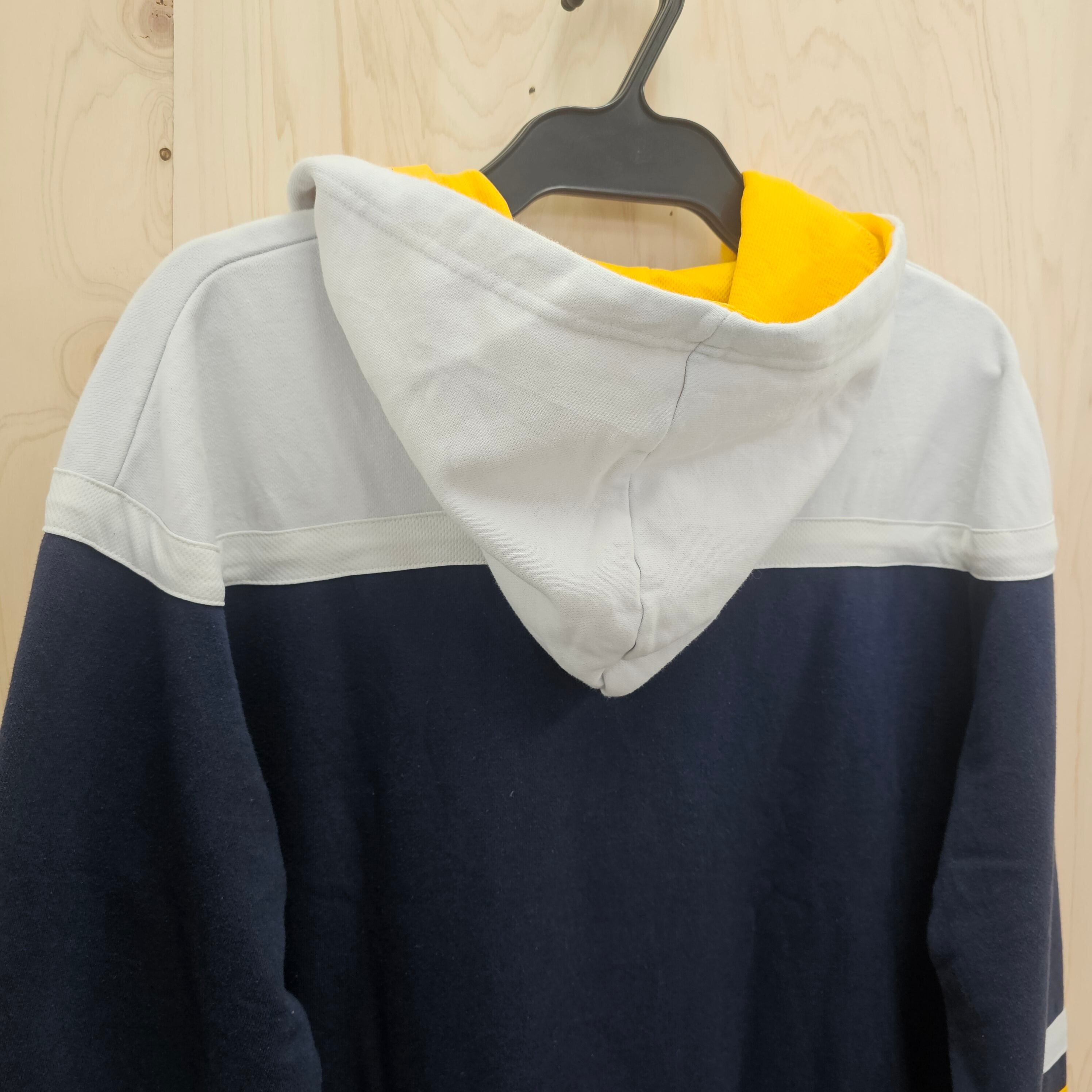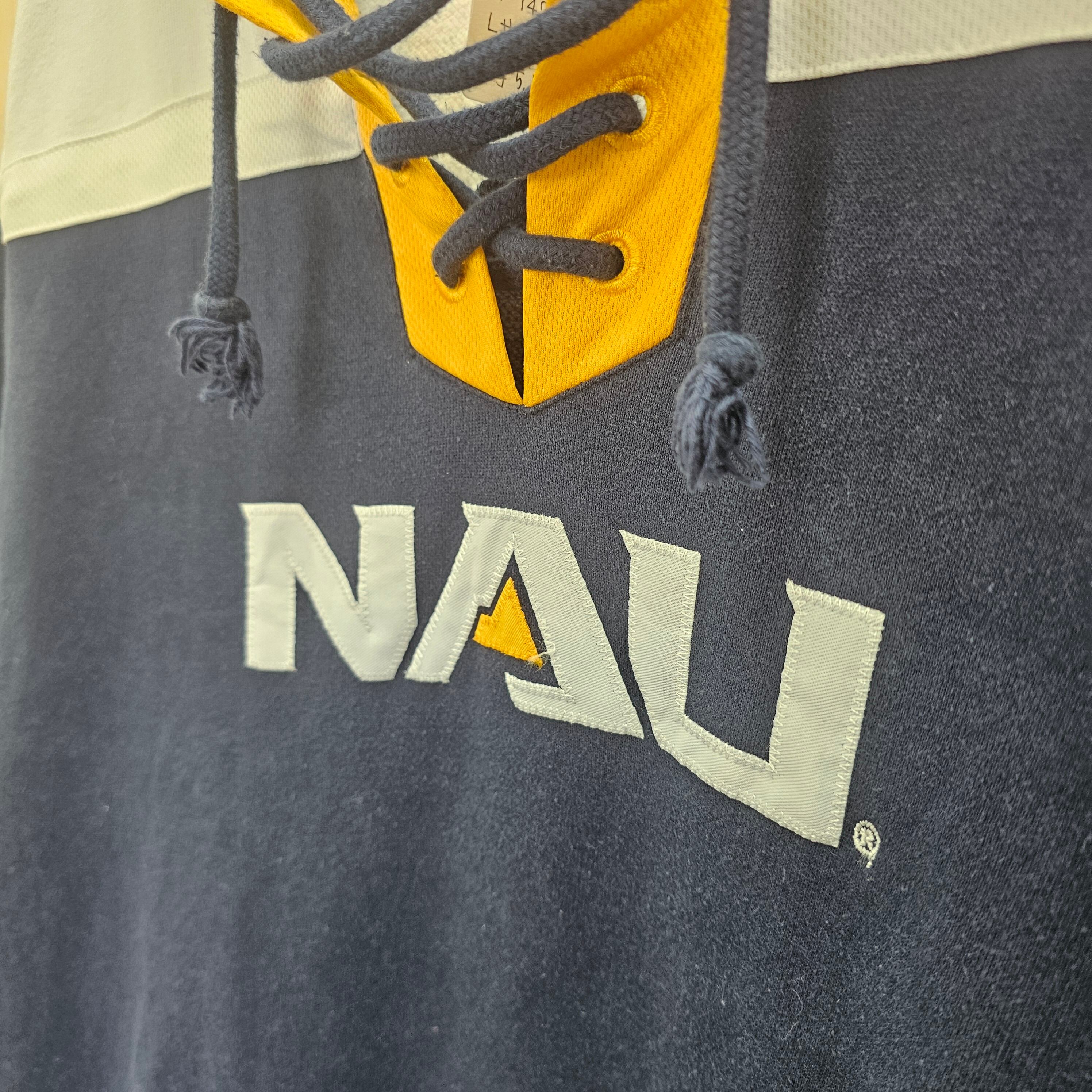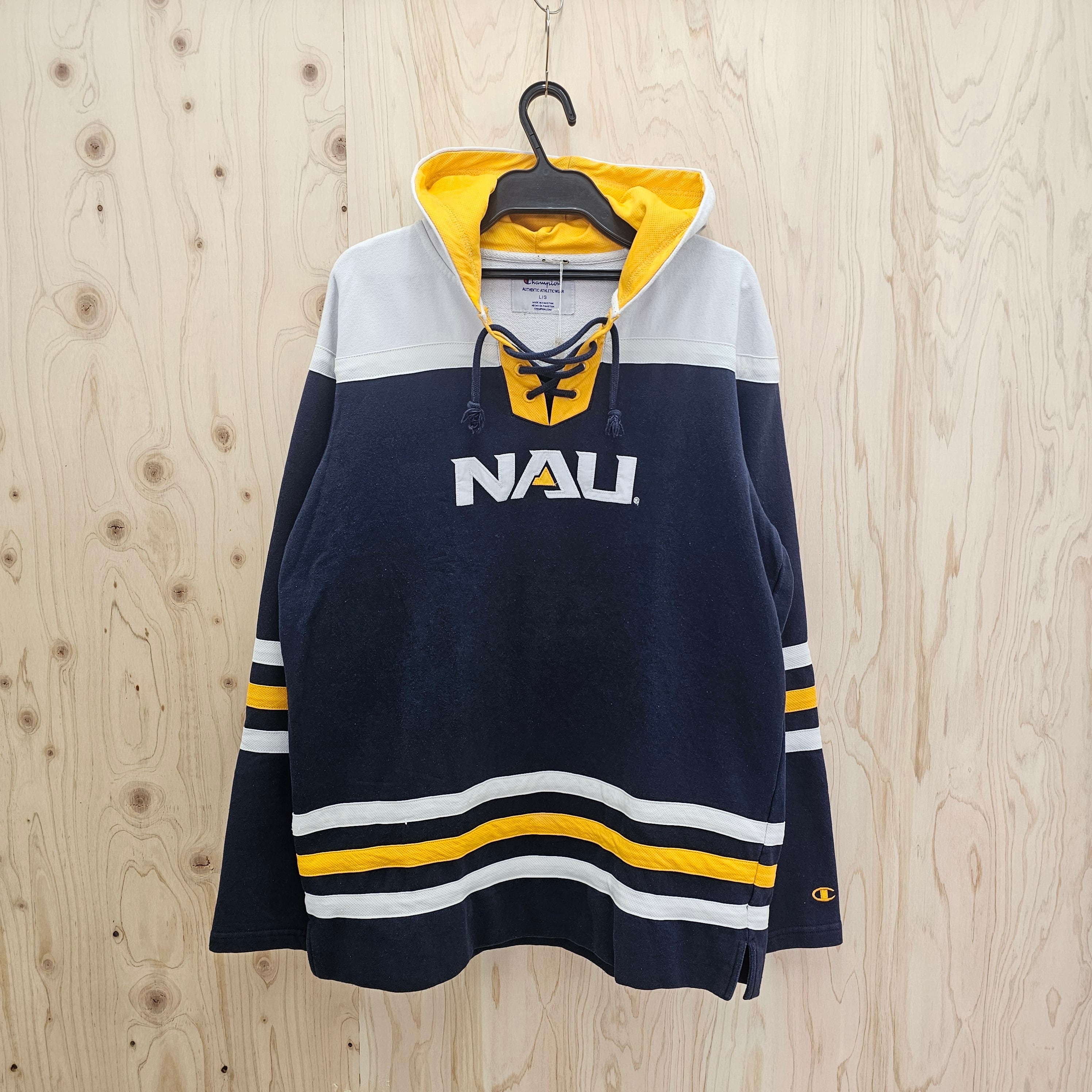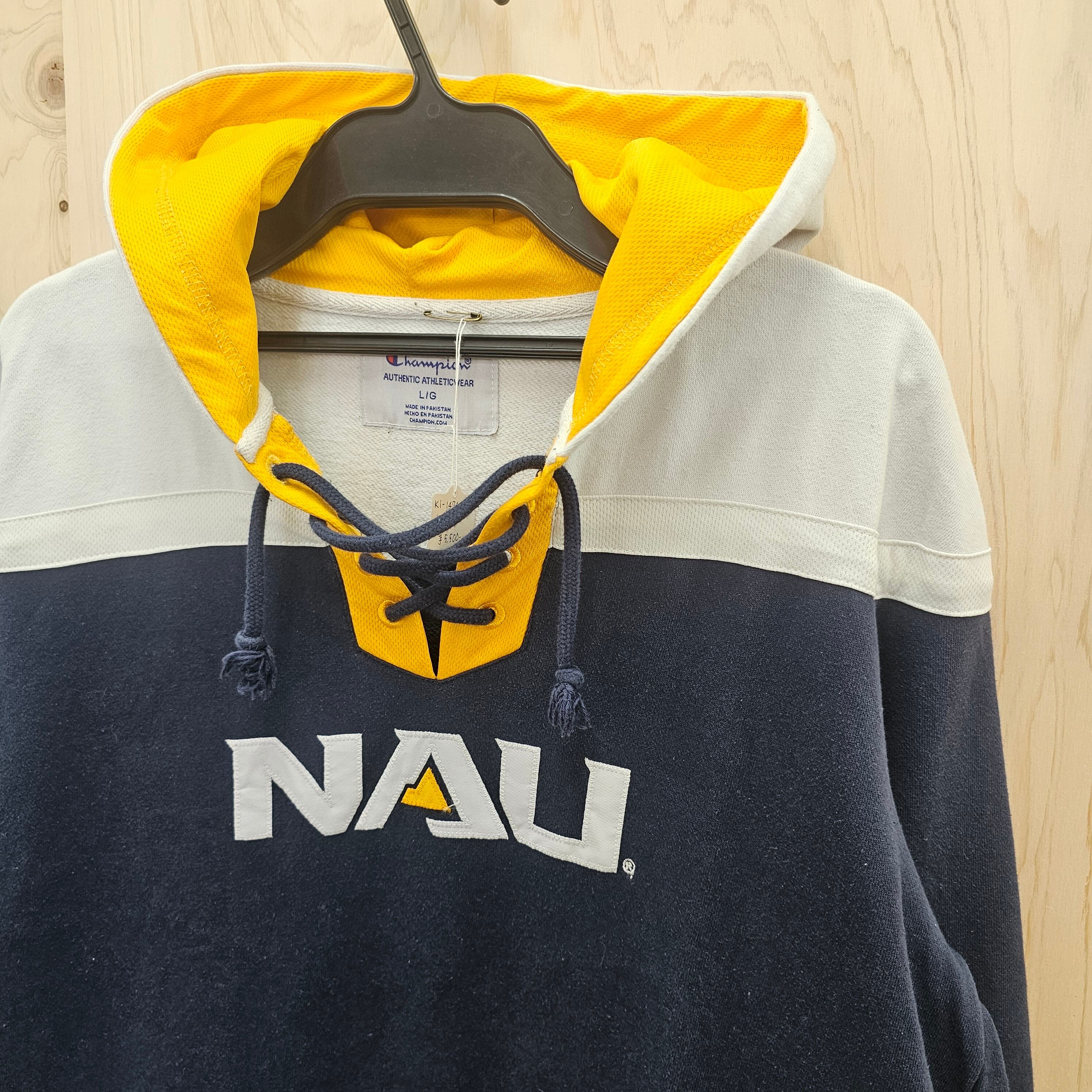 このパーカーは、ネイビー色を基調としたシンプルでありながら目を引くデザインが特徴で、フロントにはNAU LUMBERJACKSのロゴが大きく施されています。