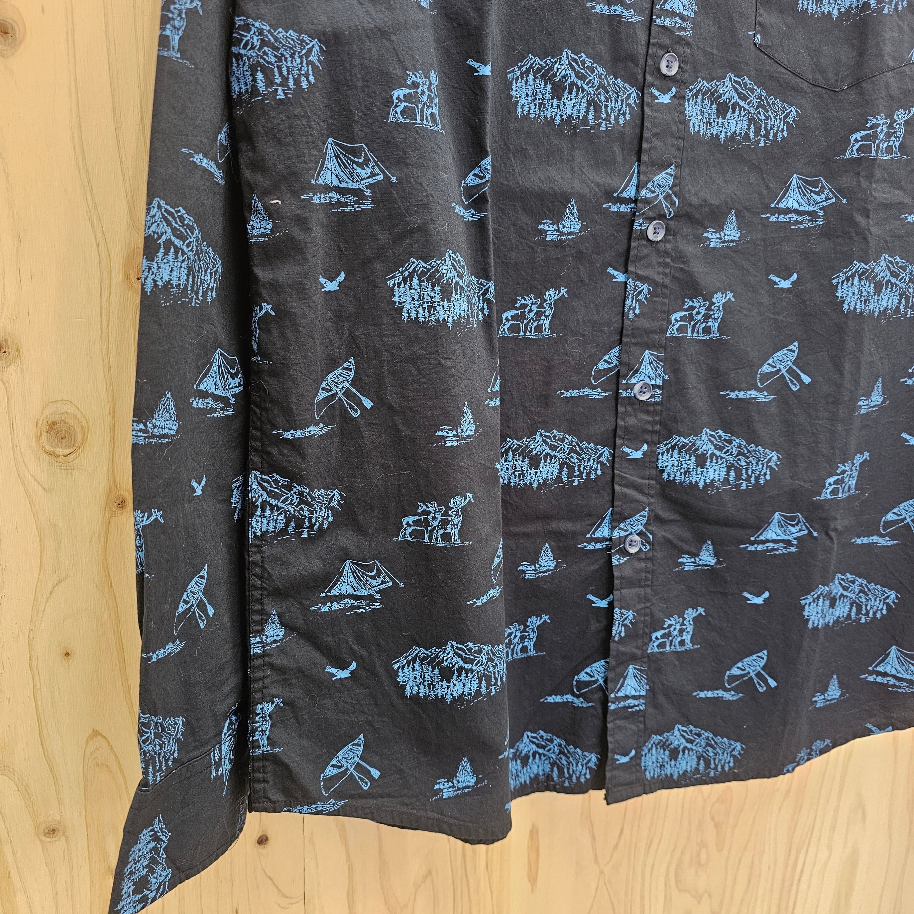 このブラック色のシャツは、ブルーを基にした様々な自然や動物、ボート、テントのデザインが目を引く美しい一枚です。