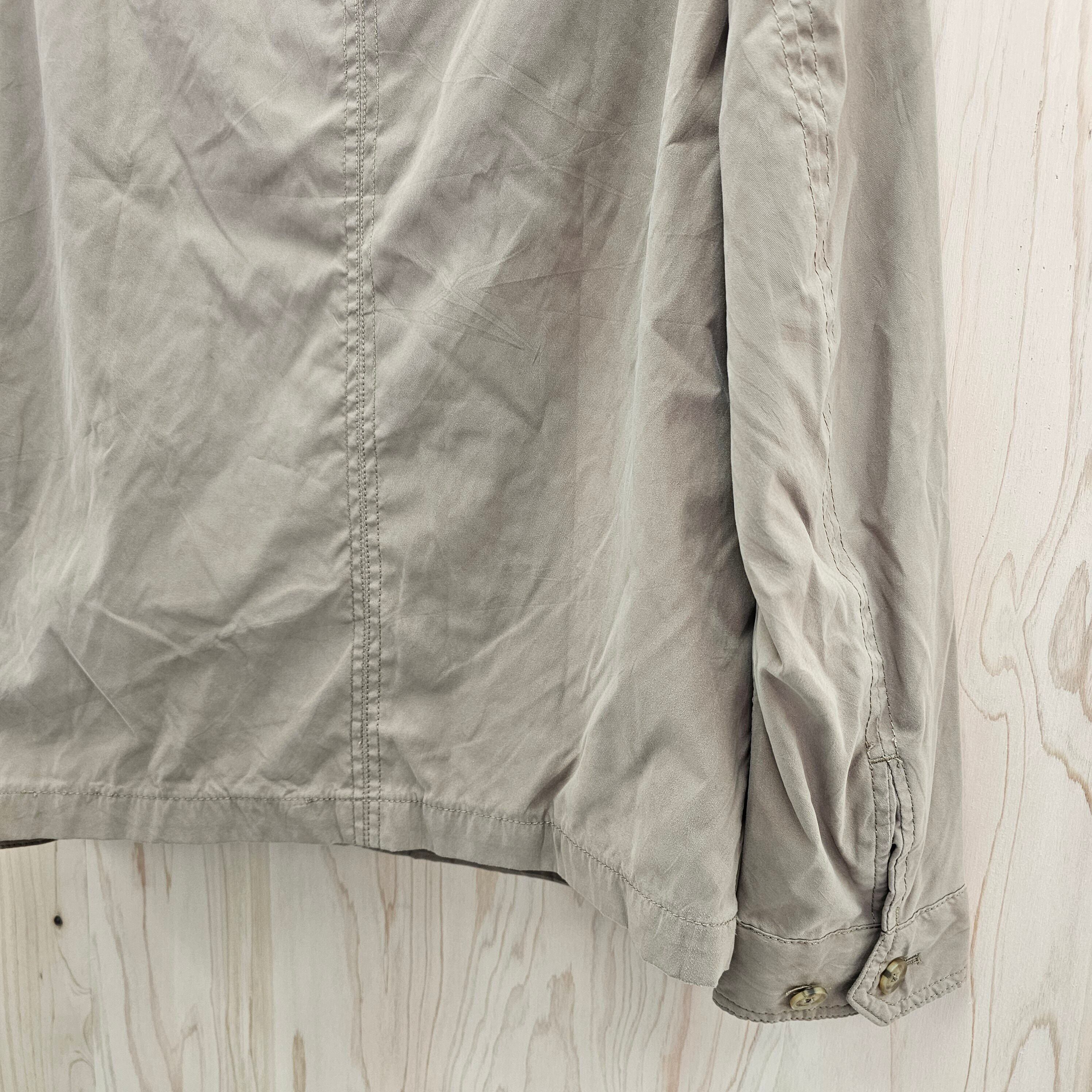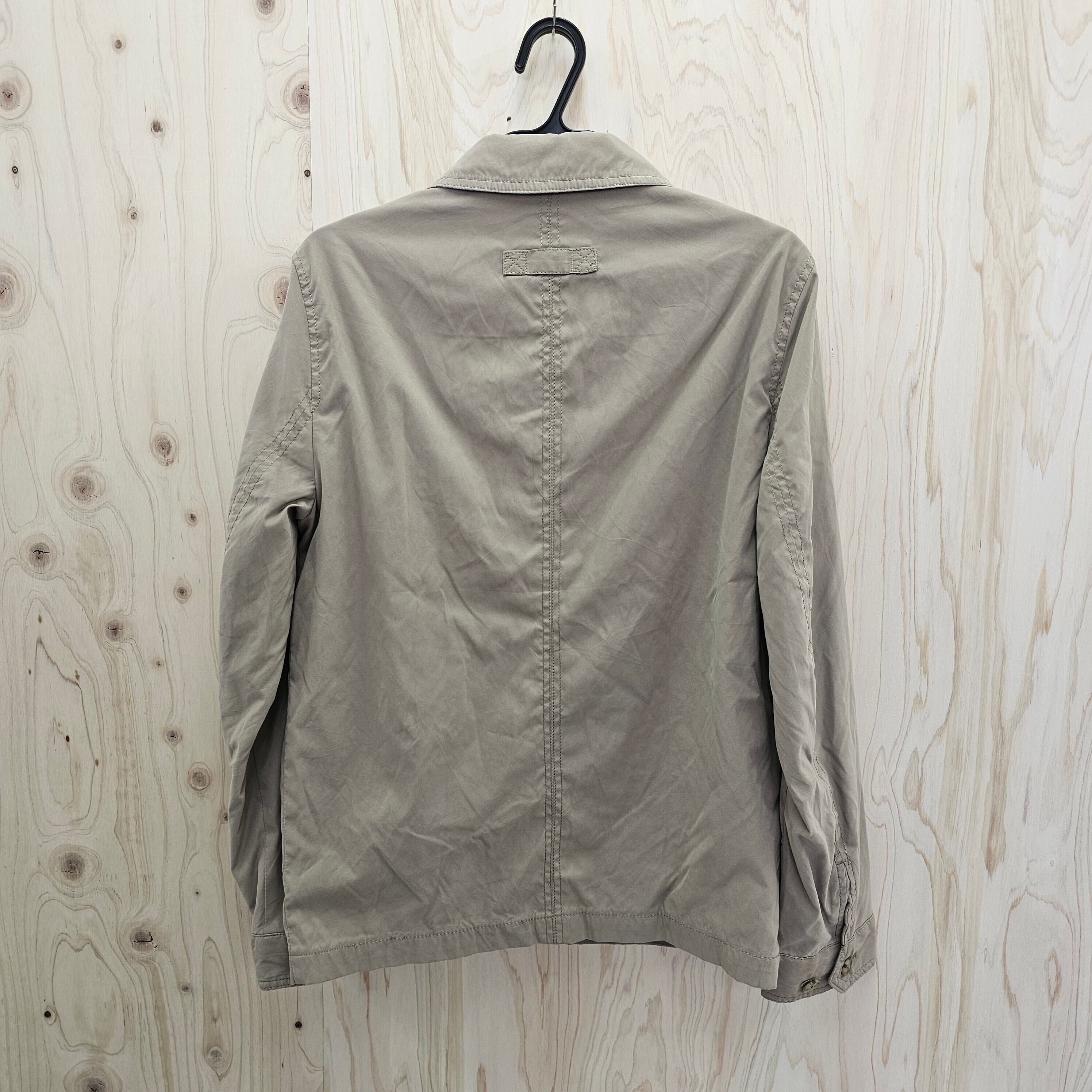 このベージュ色のアウターは、ポリエステル85%、ナイロン15%の軽量かつマッドな質感の生地を使用しており、心地よい着心地が特徴です。