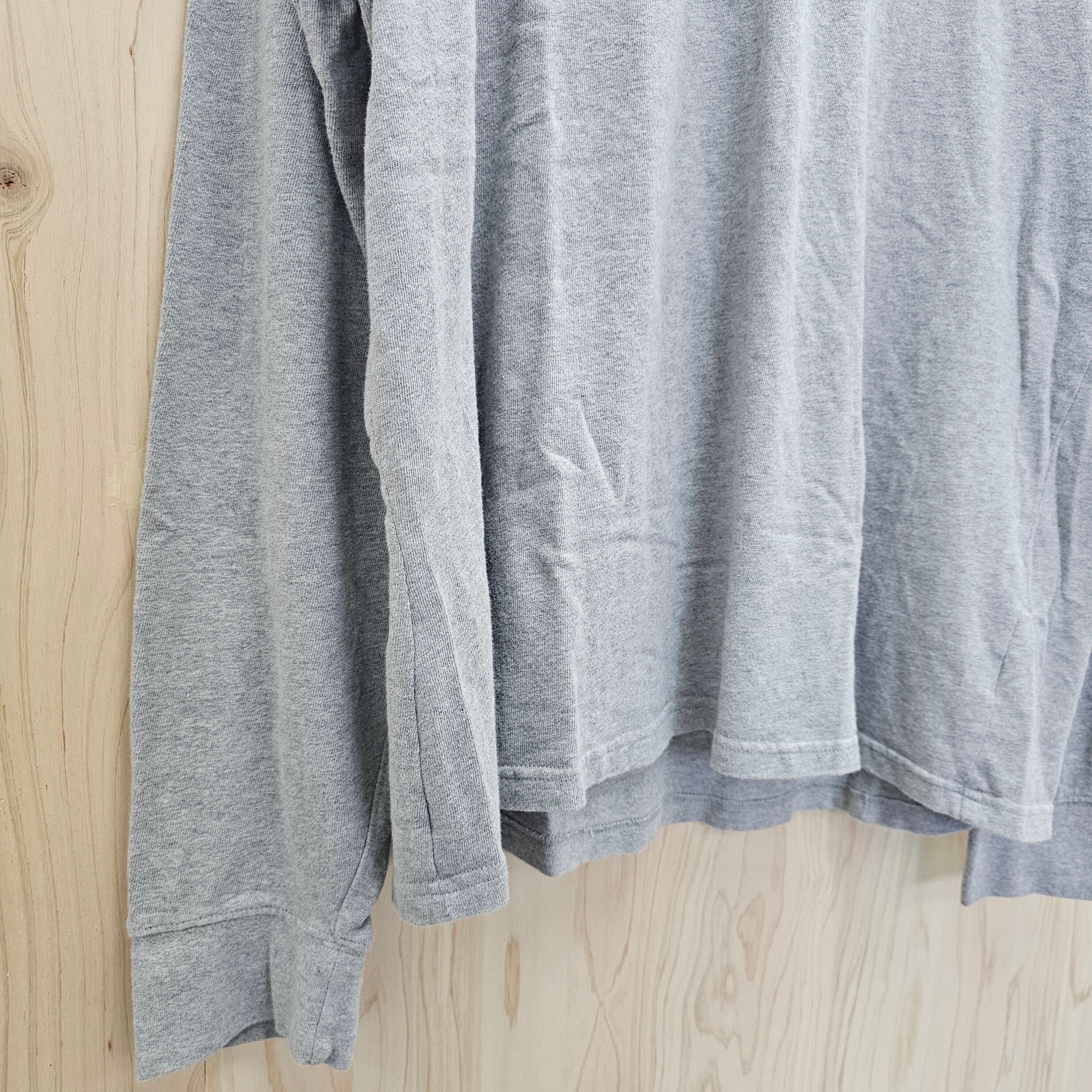 このグレー色のロンティーは、ボックスシルエットのデザインが特徴で、身幅広く着丈短めの設計により、リラックスしたスタイルを提供します。