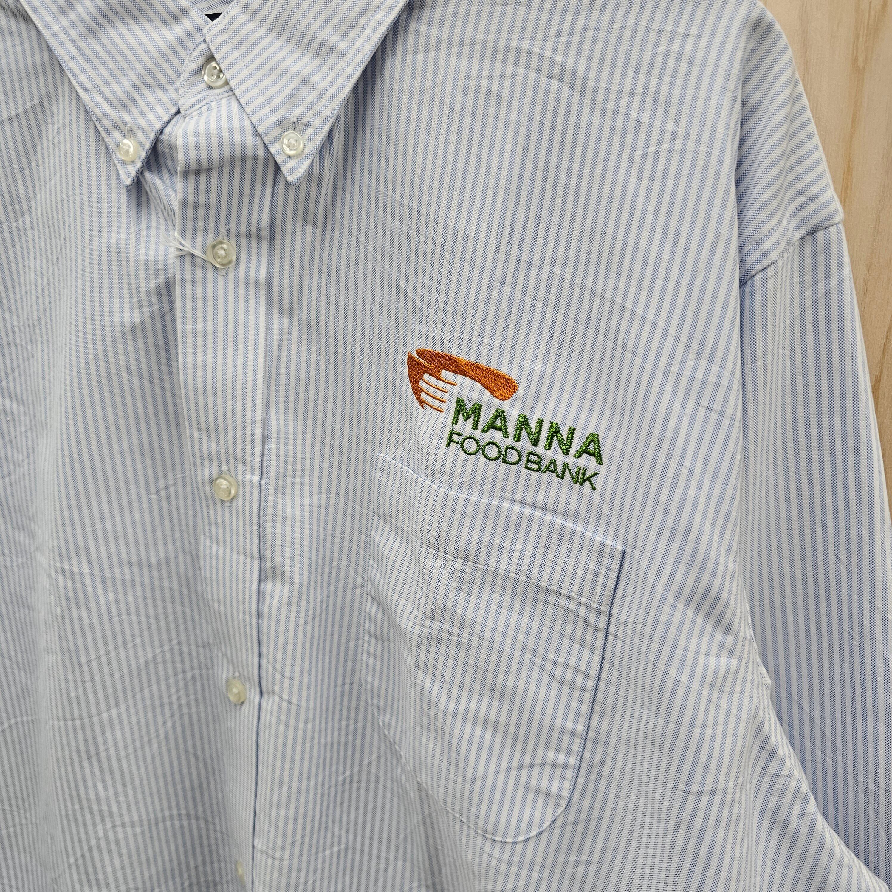 明るいブルー色のストライプデザインに、胸元には企業のデザインが刺繍されており、遊び心あふれる一着です。