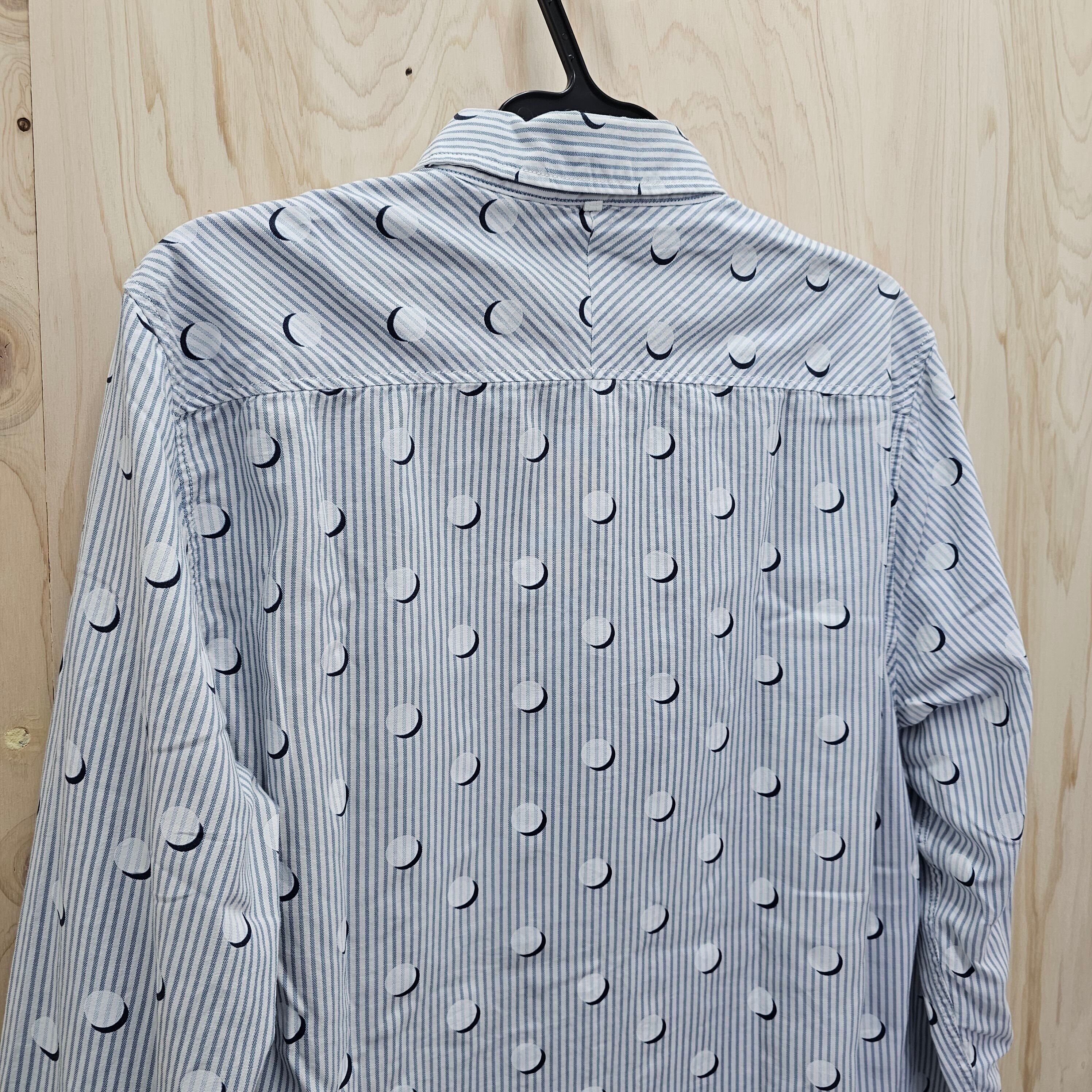 このホワイト色のシャツは、爽やかなブルーのストライプと可愛らしいドット柄が組み合わされたユニークな一枚です。