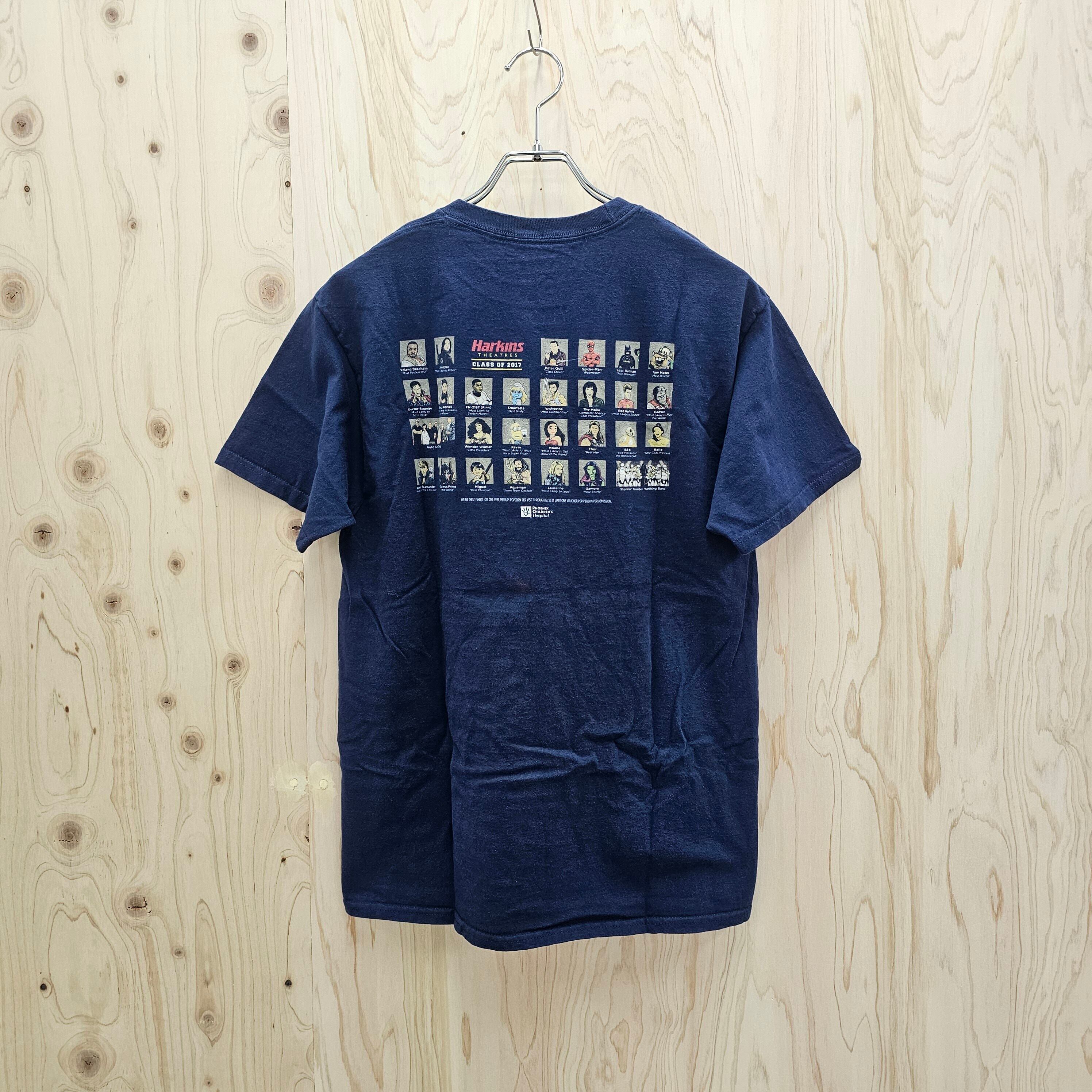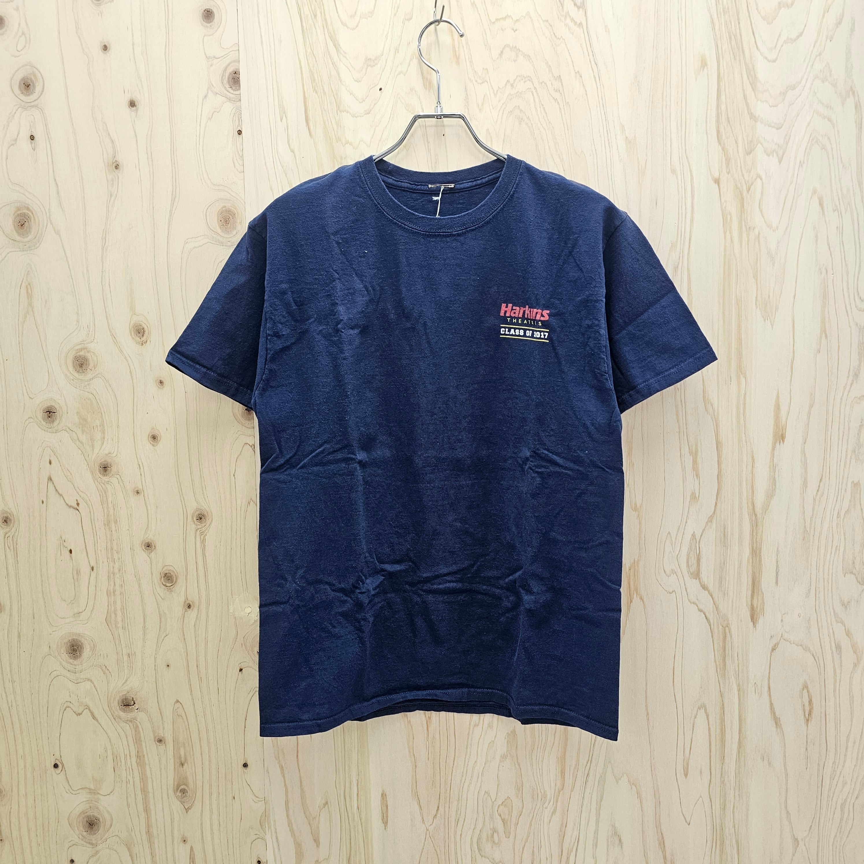 このTシャツは、胸元にHarkins THEATRESのロゴがプリントされており、ネイビー色にレッドとイエローの配色が映えるデザインが特徴です。