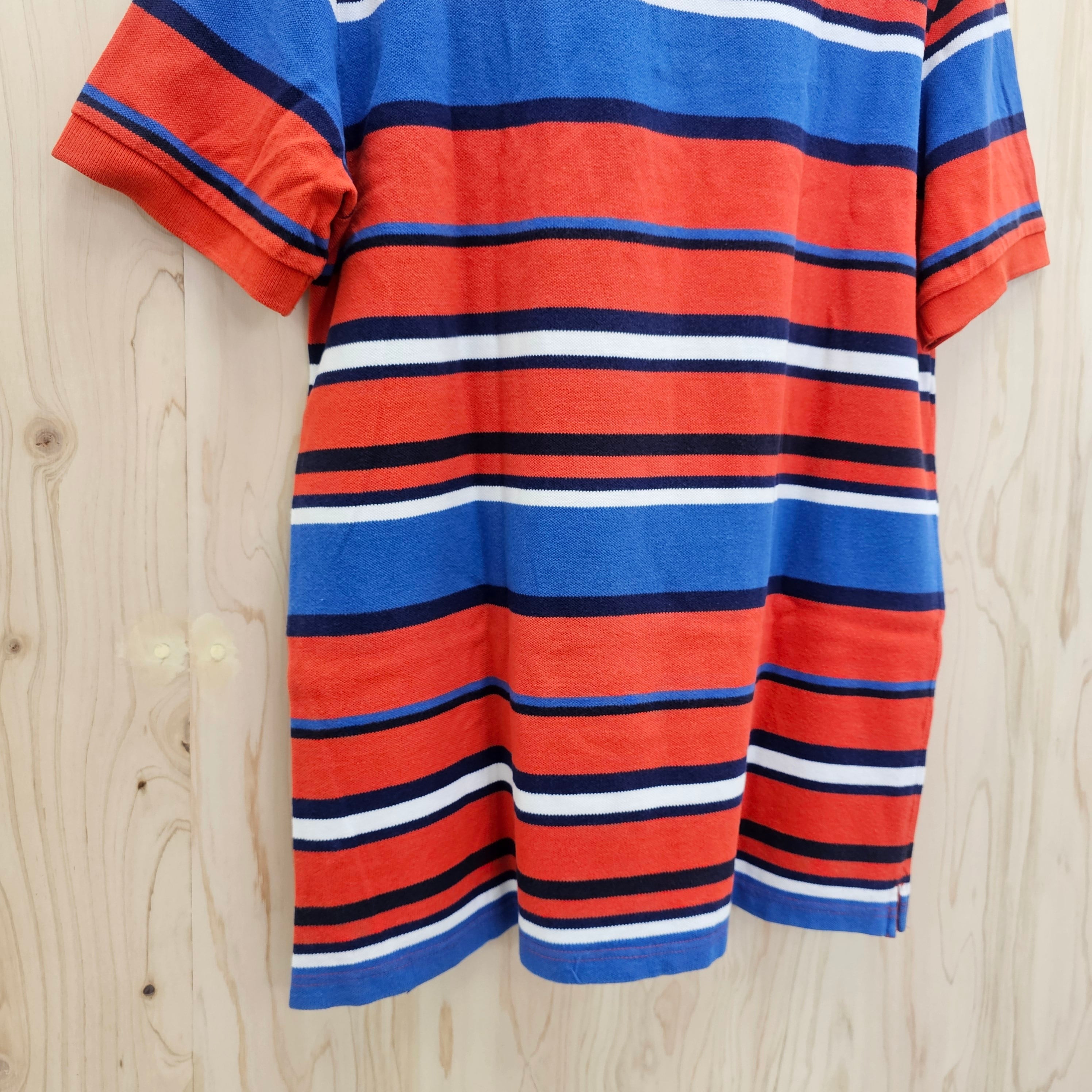 このポロシャツは、鮮やかなレッドにブルーとホワイトのボーダー柄がデザインされており、バランスの良い色使いが魅力的です。
