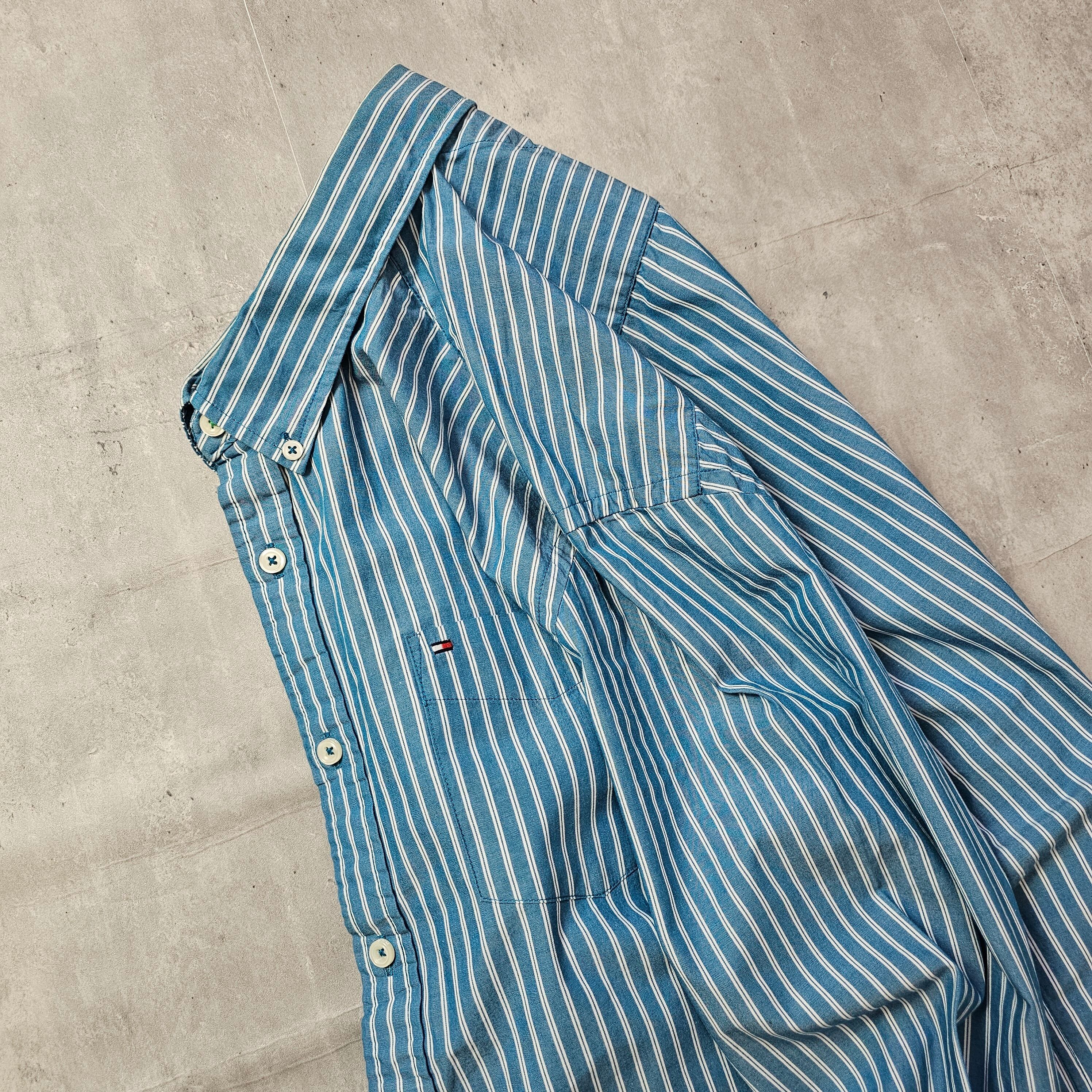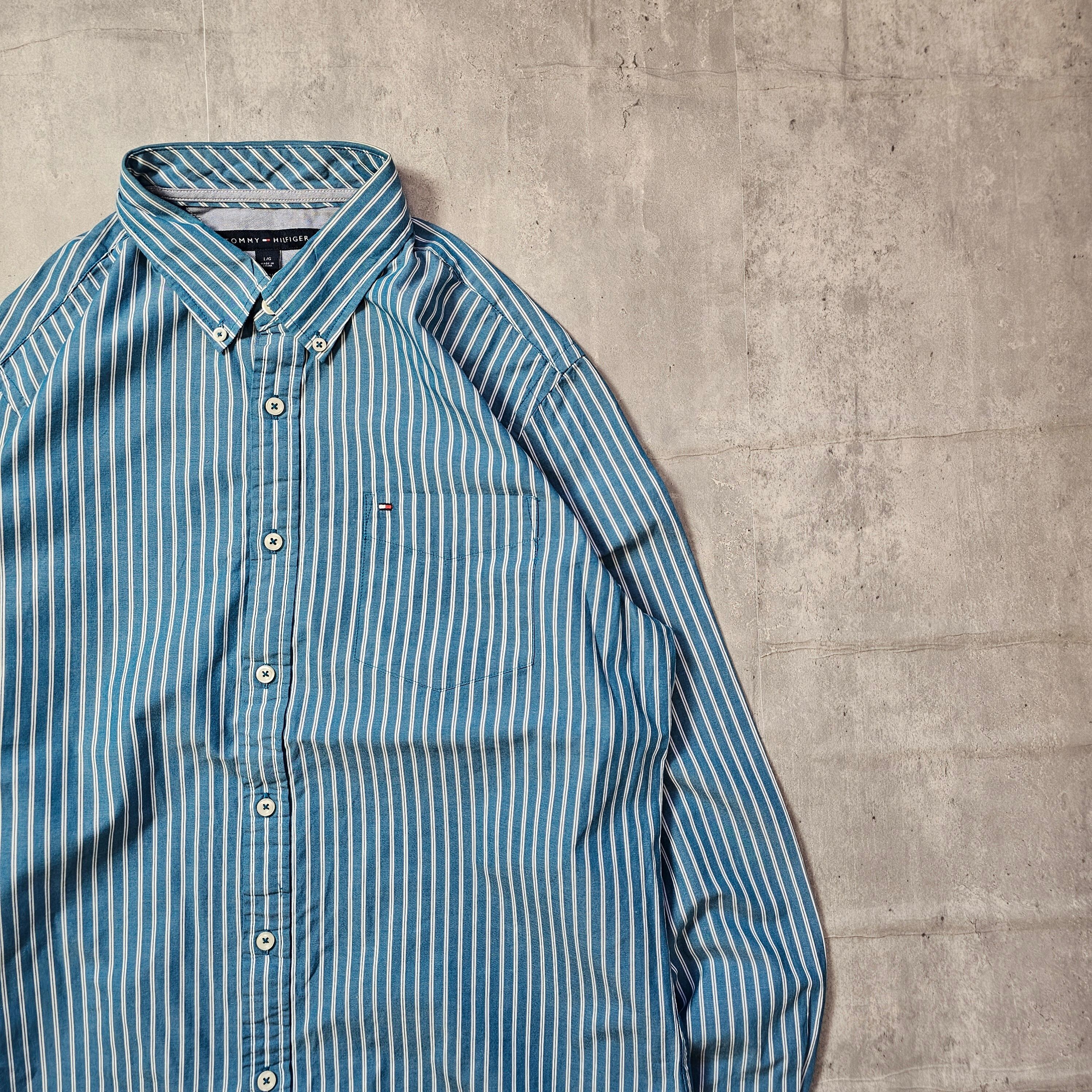【『 TOMMY HILFIGER / トミーヒルフィガー 』 BDストライプシャツ ( Lサイズ ) グリーン色 】