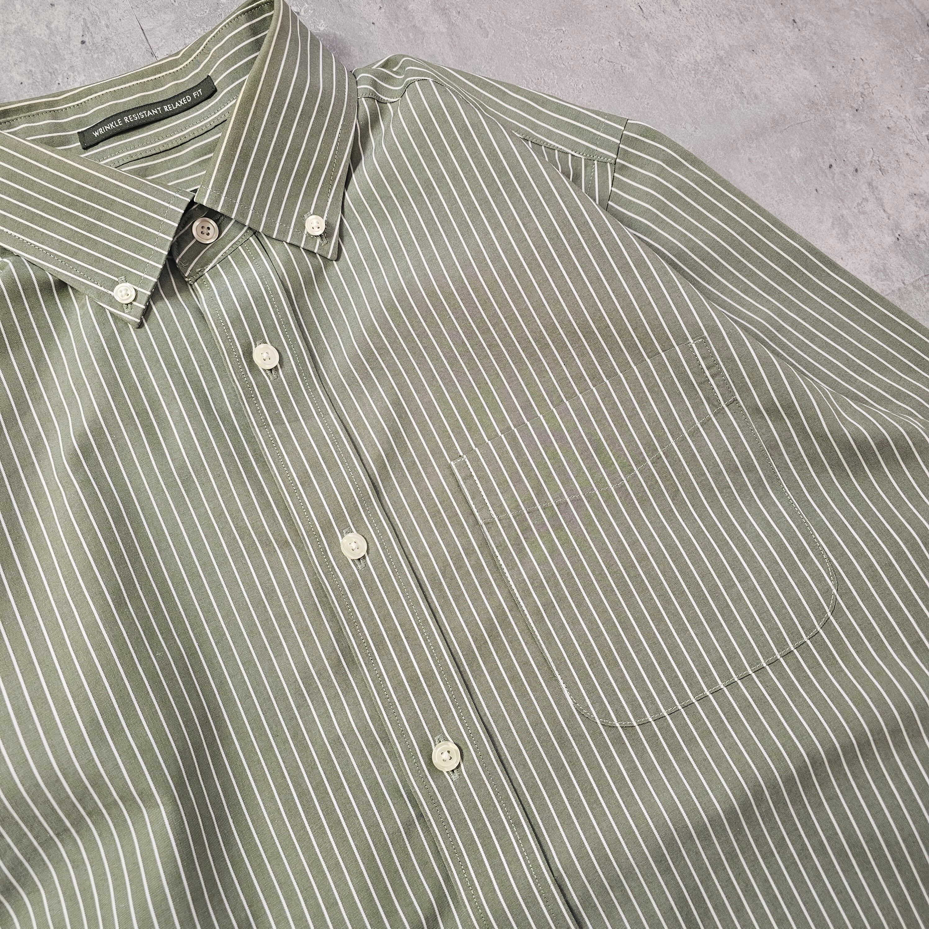 このシャツは、カーキ色にホワイトのストライプ柄がデザインされており、お洒落さを引き立ててくれます。